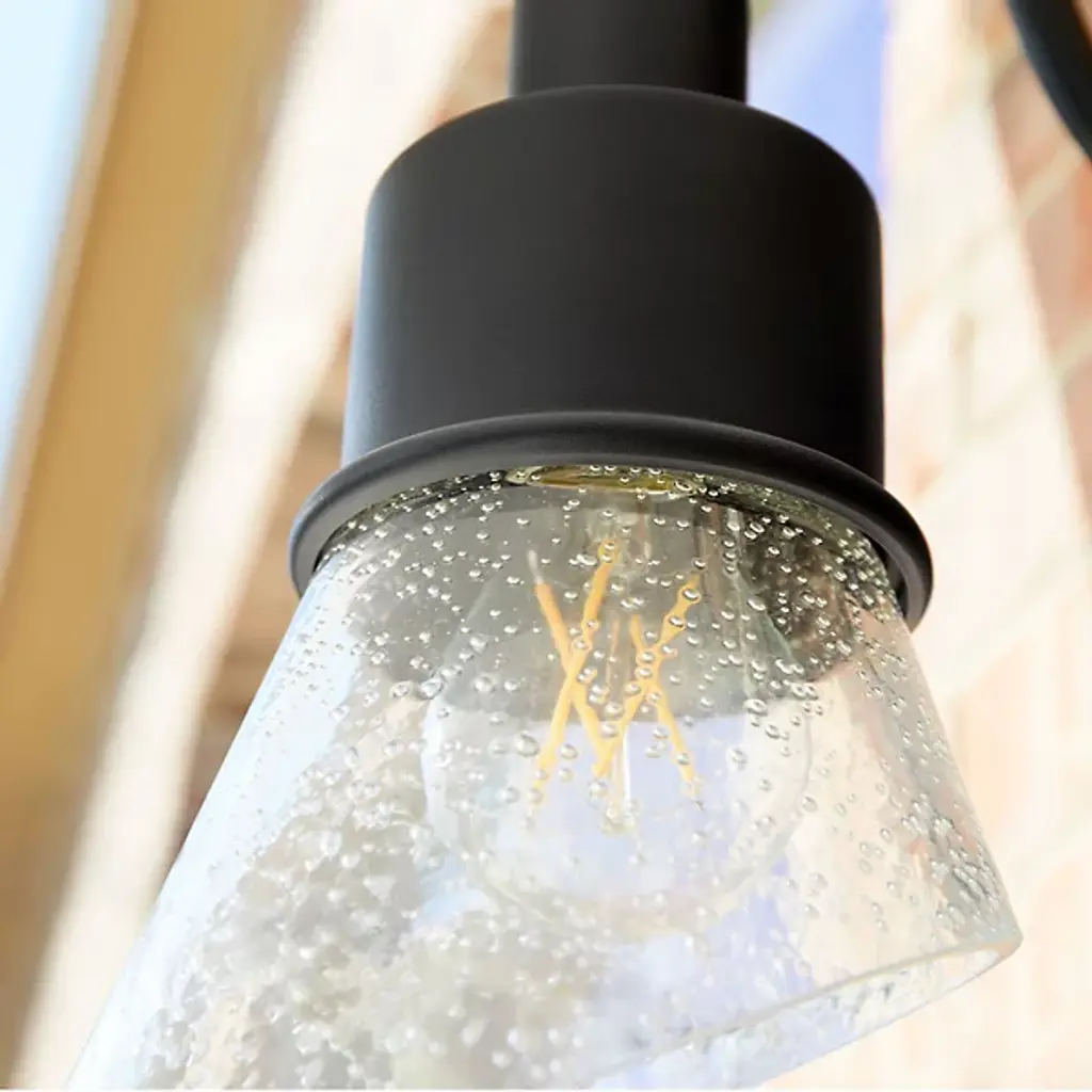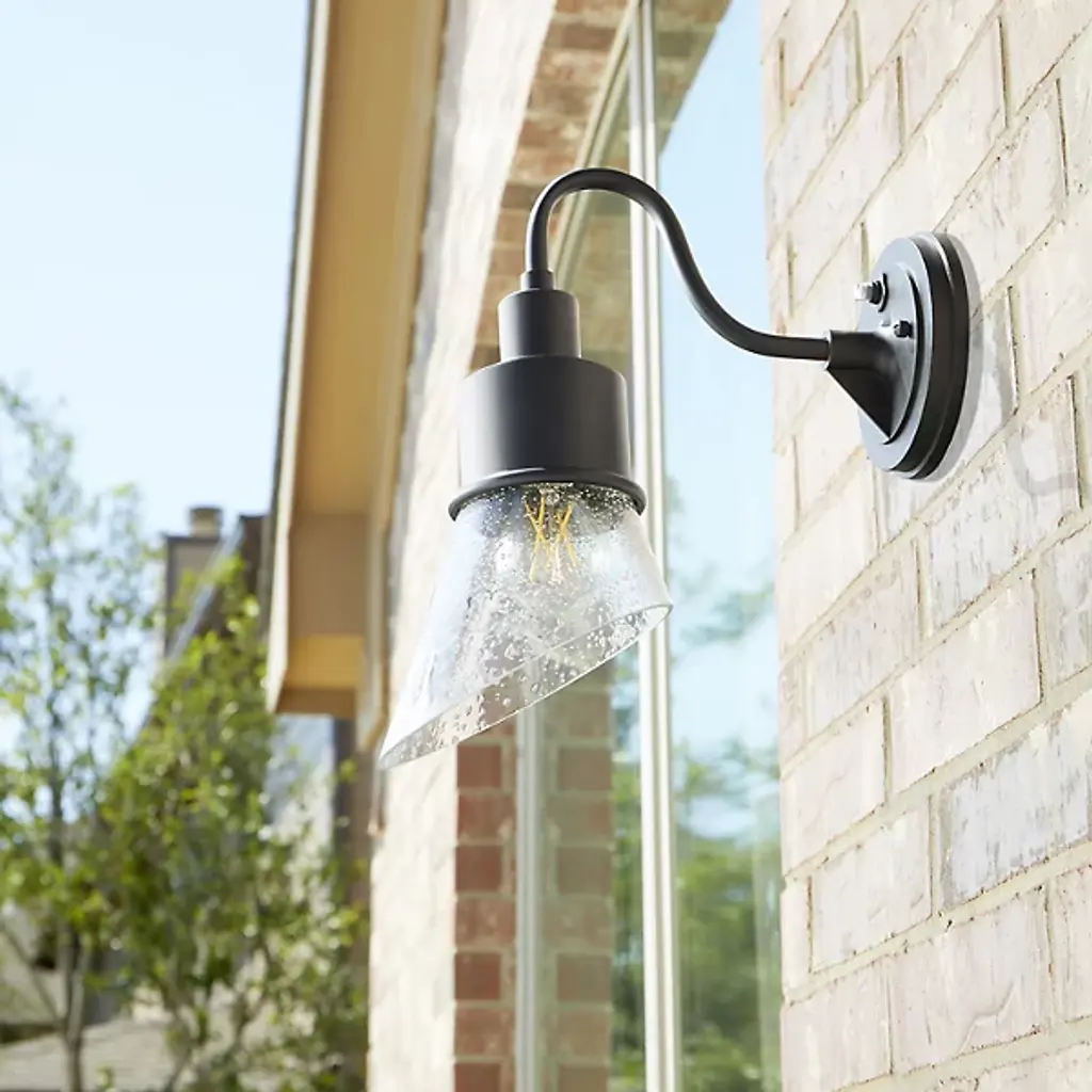 Crisp and elegant, the Torrey Outdoor Wall Sconce with Glass Shade from Quorum International unites the space with a simple, yet eye-catching form. A simple disc-shaped wall mount extends a waving arm that rises upward before dropping and presenting a tapered base for the lamping. A single bulb is encased within a clear glass shade that angles sharply. Sprinkled with a seeded, watery texture, the bulb shines a warm, inviting glow, setting the tone of the space through form and function. With a wet rating, this piece can spread a clean illumination that enchants your favorite outdoor space, no matter the weather.