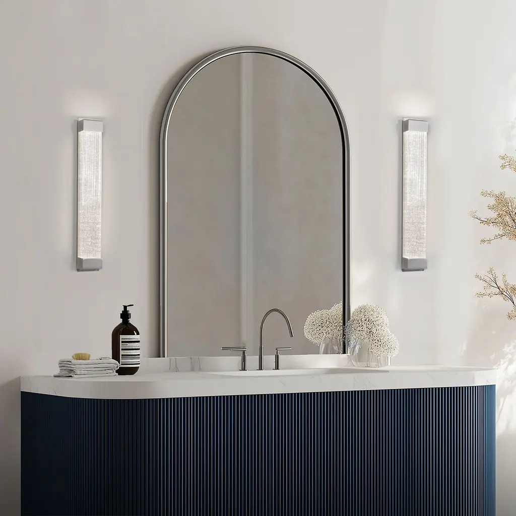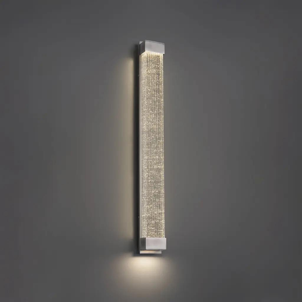 The Tower wall sconce features a rectangular cylinder of ribbed glass, mounted on a sleek metallic backplate, creating a visually intriguing display from 3500K LED illumination. Gleaming metal caps on each end add a polished touch, and the wall sconce can be mounted vertically or horizontally to suit your space. Offered in 14, 20 and 27-inch sizes, Tower is available in a choice of aged brass or brushed nickel finishes.