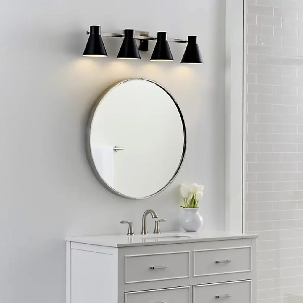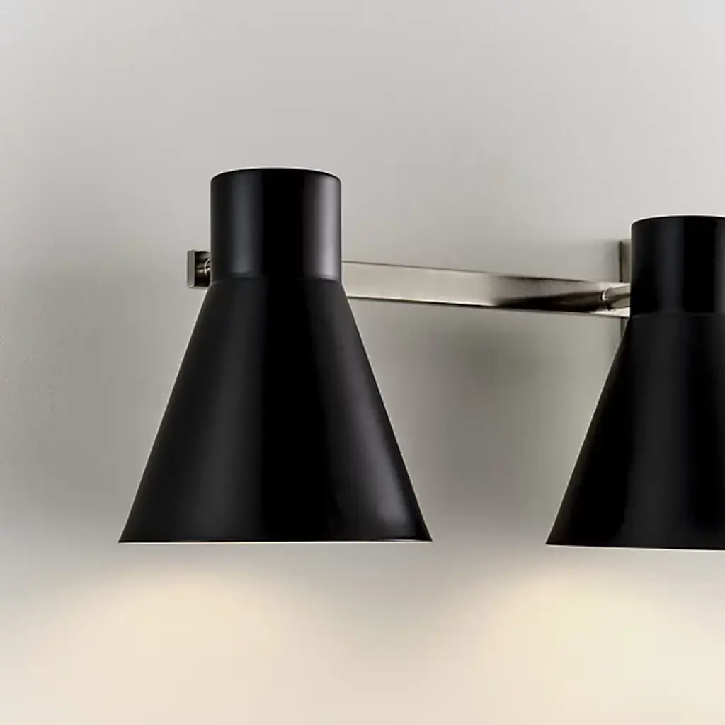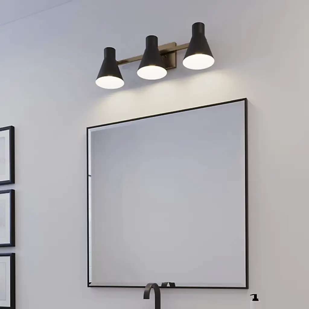 Brighten up your bathroom into with the Towner Vanity Light by Generation Lighting, formerly known as Sea Gull Lighting, This clean-surfaced steel construction has a retro-modern flair and starts with a low-profile rectangular wall plate that anchors a long bar structure across its upper half. This bar holds flared metal shades with a matte exterior over wet-listed lamping that’s Title 24 compliant and Energy Star rated, focusing pools of light below while blocking excess brightness from the sides.