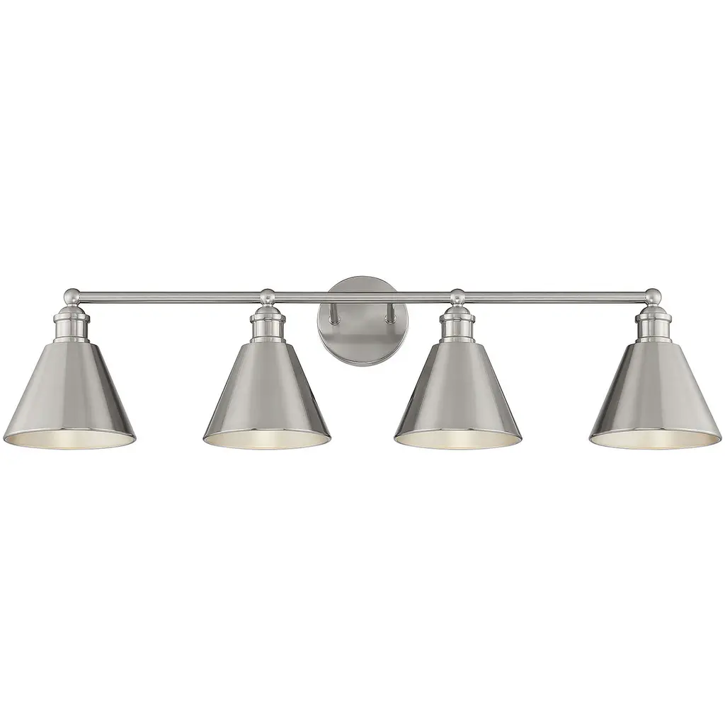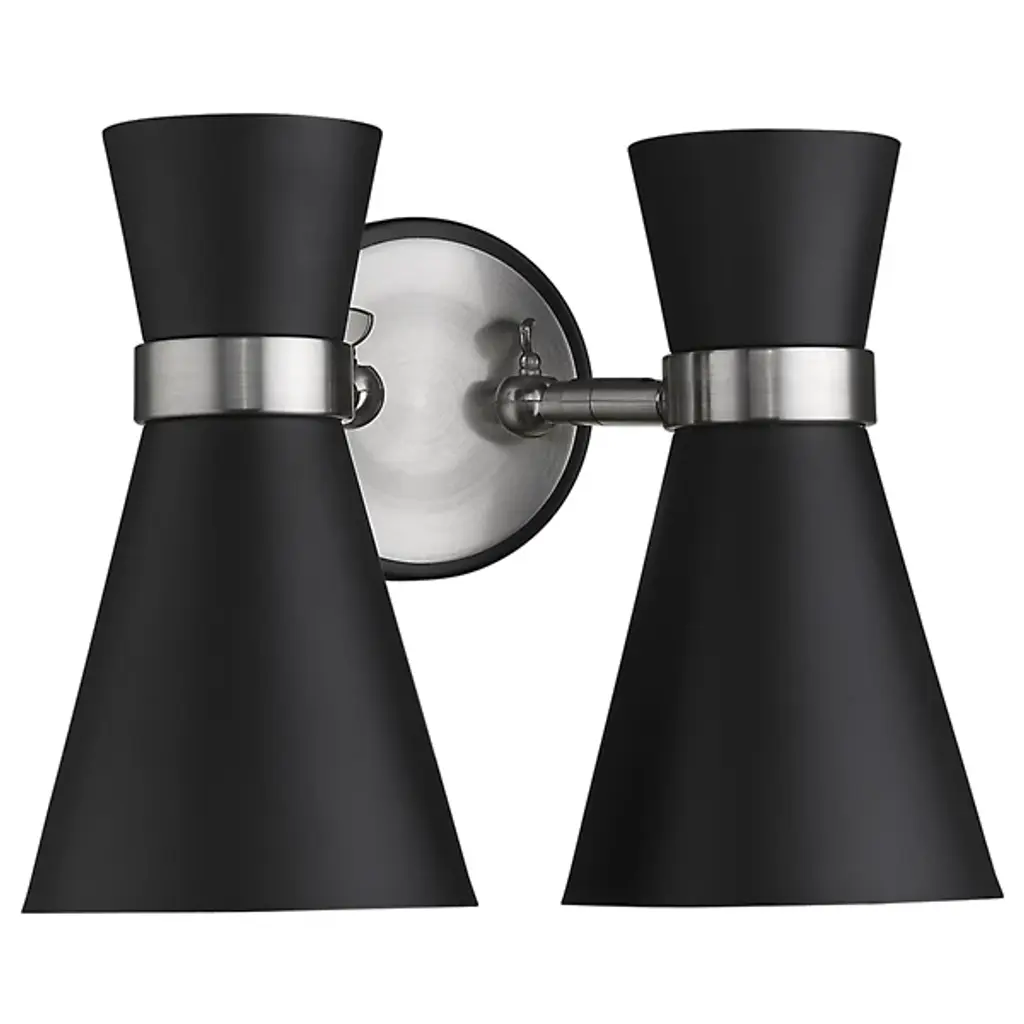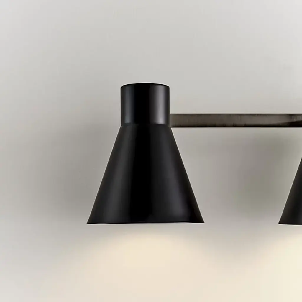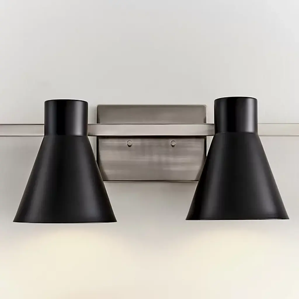 Brighten up your bathroom into with the Towner Vanity Light by Generation Lighting, formerly known as Sea Gull Lighting, This clean-surfaced steel construction has a retro-modern flair and starts with a low-profile rectangular wall plate that anchors a long bar structure across its upper half. This bar holds flared metal shades with a matte exterior over wet-listed lamping that’s Title 24 compliant and Energy Star rated, focusing pools of light below while blocking excess brightness from the sides.