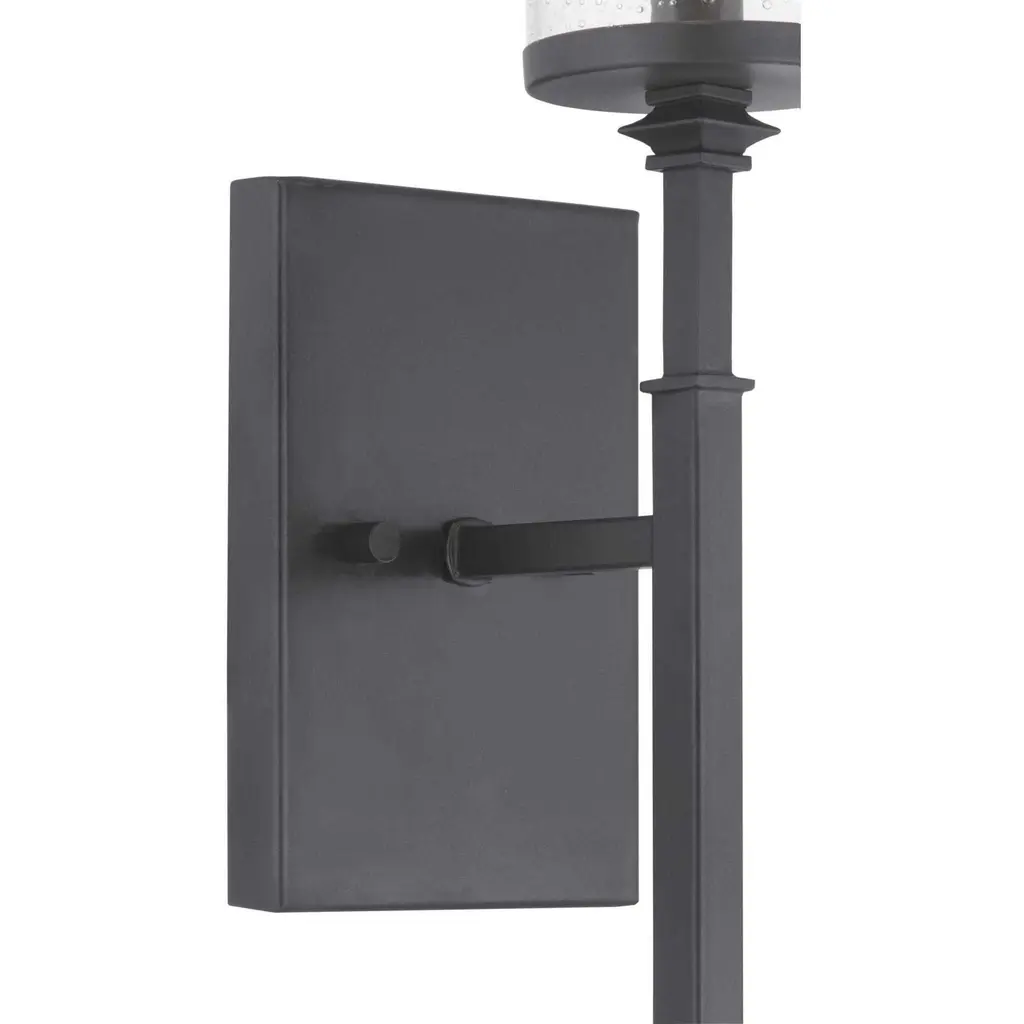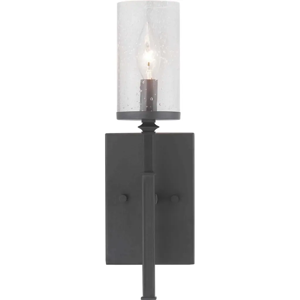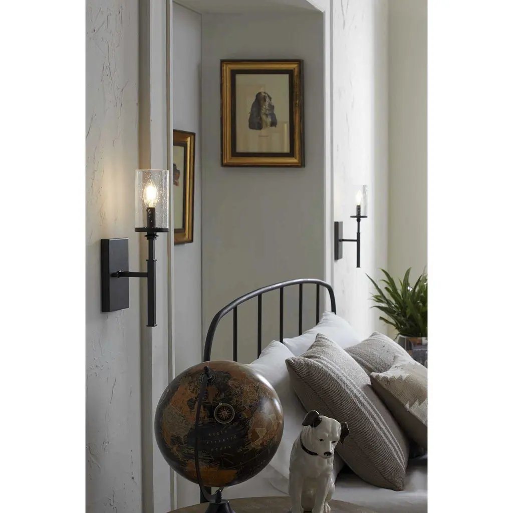 A display of substantial style in an one-light wall bracket, Tralee Collection’s frame was inspired by the elegance of traditional iron structures. Specific attention to forging details creates a distinctive collection for Transitional and Farmhouse interior spaces. Seeded glass shades and a Graphite finish pair together to complete the look.