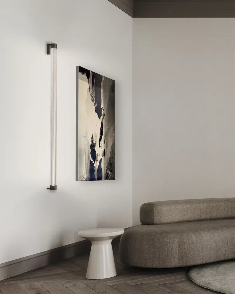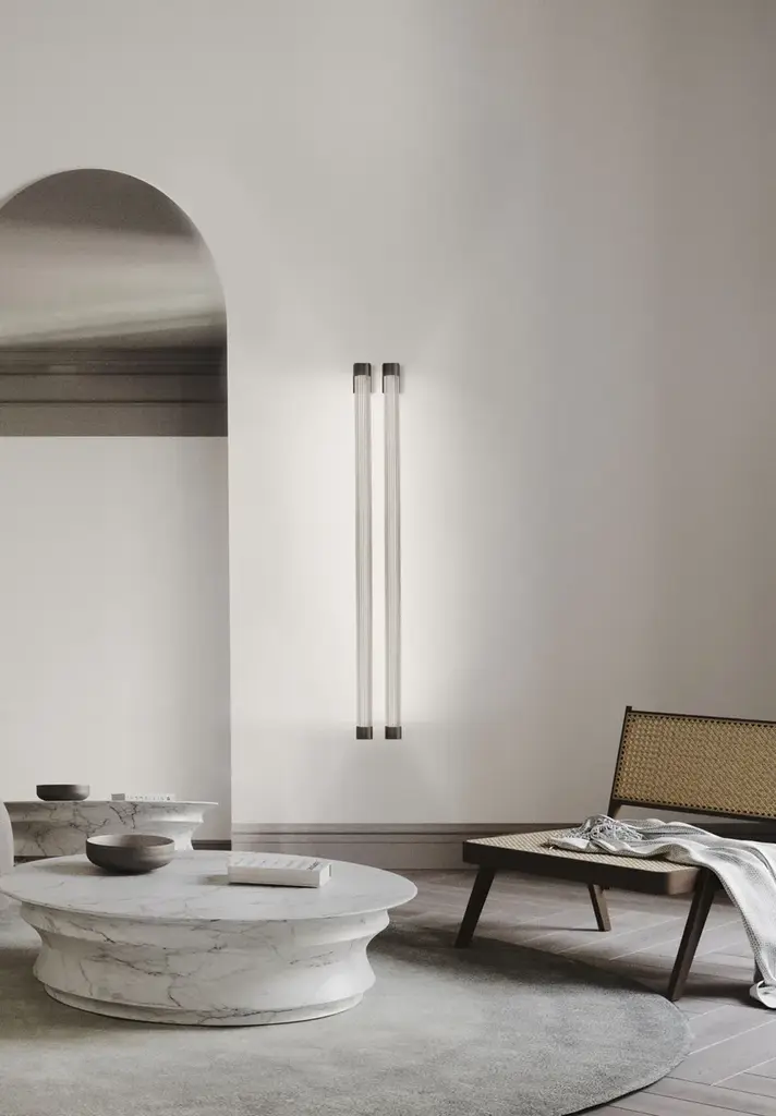 Trama WAL LAMP 120 - 70 is a borosilicate glass wall lamp.360° neon flex 21,6W 3000°K 24 Vdc SMD 2835T 2536,8 lmlife time 50.000 hrs Dimmable: yesTrama is a collection made up of single elements in different lengths but which, when placed side by side, can create ad hoc projects even of large sizes. they recreate a customizable light pattern in the air.Trama's elements are made of transparent or colored borosilicate glass with turned aluminum bushings and molded metal covers at the ends.The light source is a 360° Neonflex, that lights up the borosilicate tube along its whole length. Inspired by the intricate interweaving of fabrics, Trama combines the transparency and purity of glass with the sophisticated structure of straight tubes. Each element, meticulously worked, recalls the delicacy of the intertwined threads, creating a play of light and shadow that dances in space.Trama is alrealdy available in the sizes shown in the drawings but it is possible to request customized configurations.