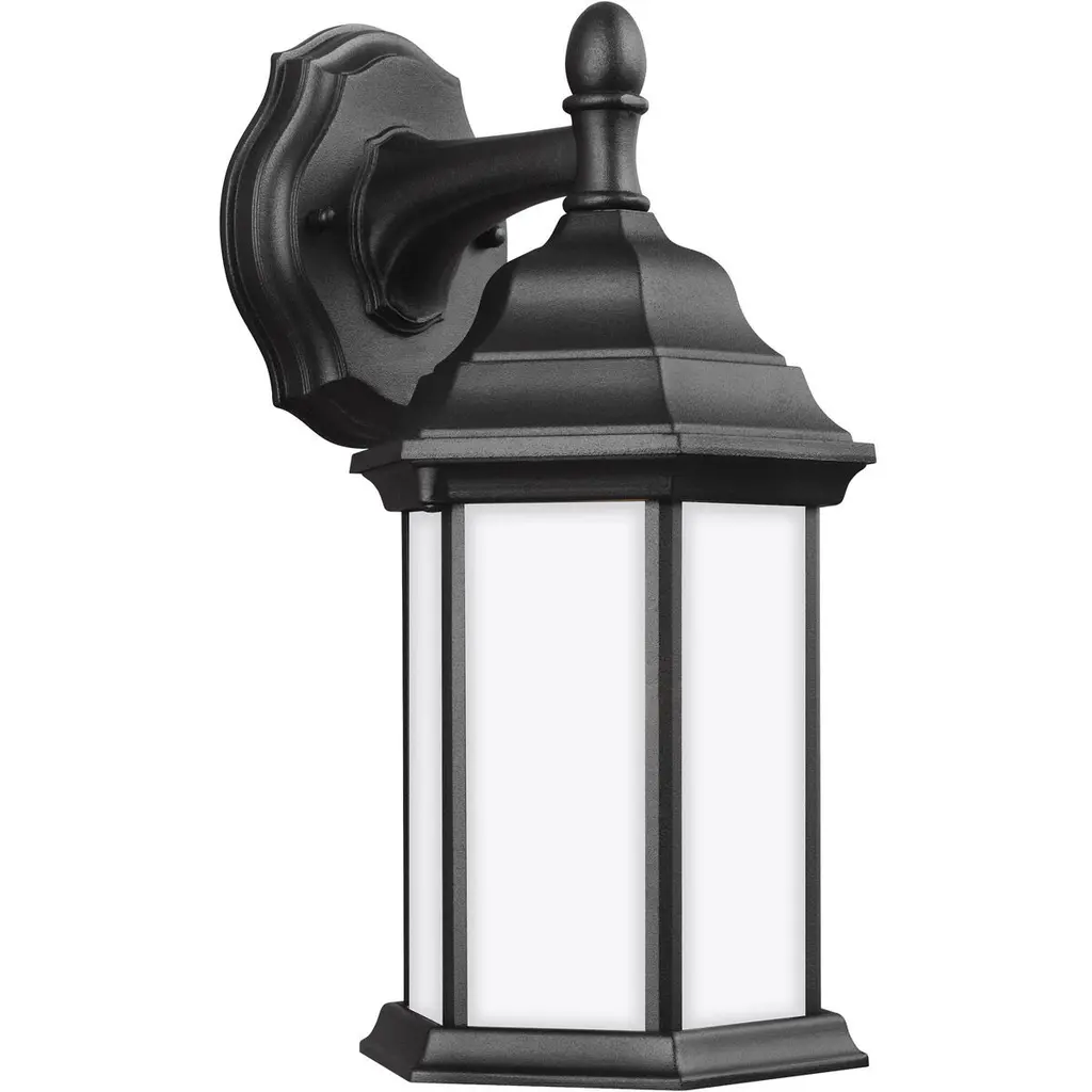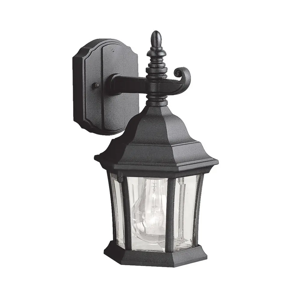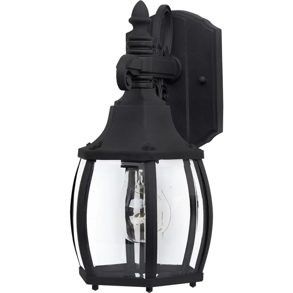 Brighten up your great outdoors with the timeless traditional look of this Meridian 1-light outdoor wall sconce. Its lantern inspired structure includes clear beveled glass shades and is finished in versatile black. 14.25" height, 6.25" width, extends 7.5" from the wall. Max 60 watt bulb, standard size A19 bulb recommended. LED bulb compatible. Wet area rated.