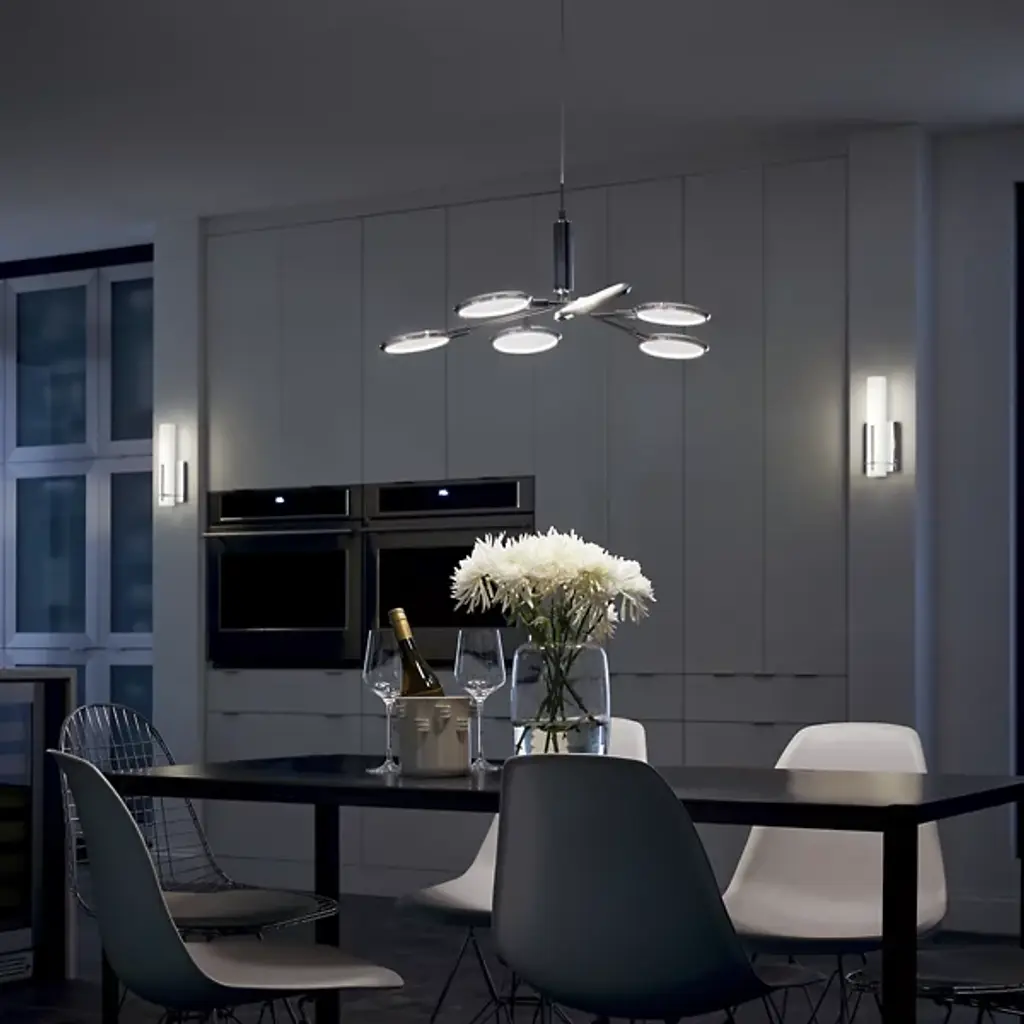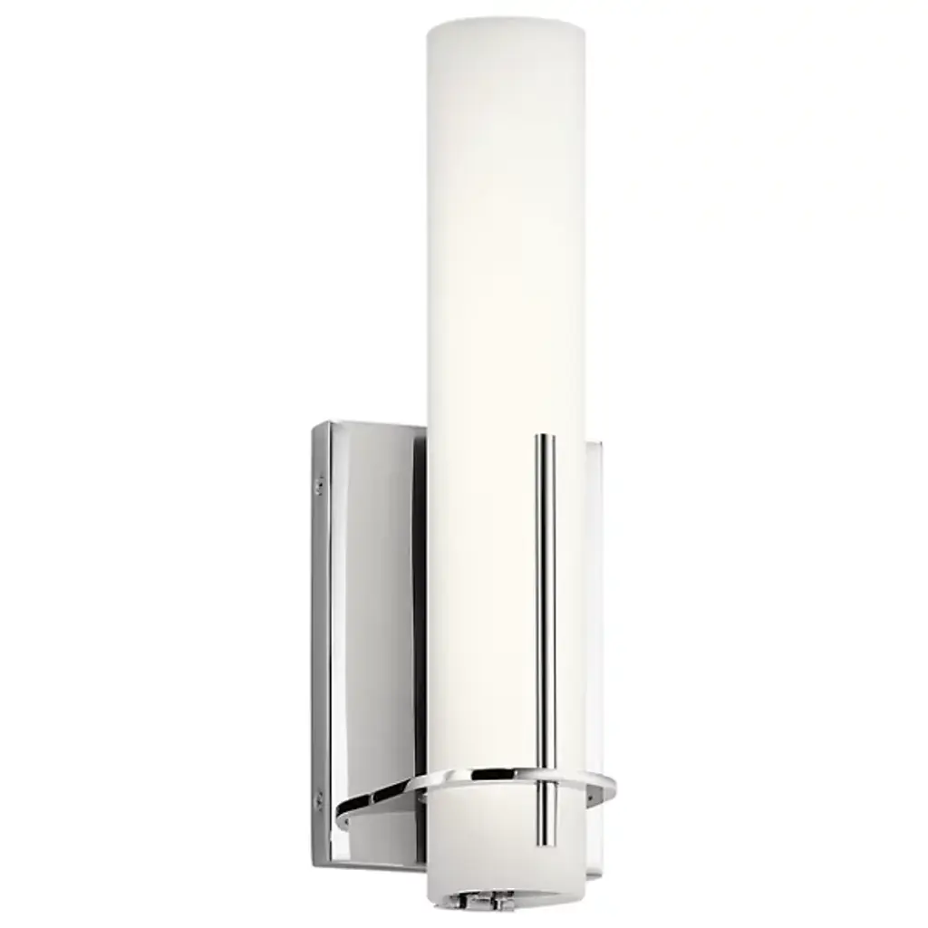 The Traverso LED Wall Sconce by Elan Lighting provides clean, contemporary lighting for a variety of locations. Whether in the living room or the bathroom, this sconce blends well with its prominent, yet unassuming Etched Opal glass shade and metallic body (including a thin rod accent). Lighting is produced by integrated Warm White LEDs which permeate the shade for a soft, even ambiance that plays off the surrounding metal.