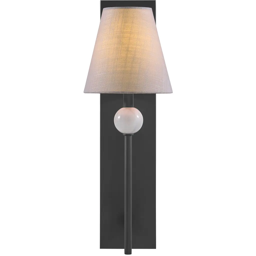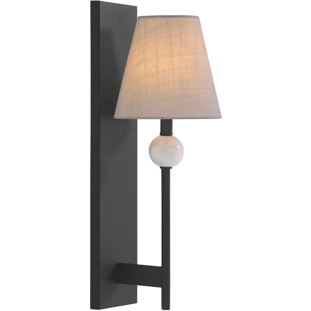 The effortlessly elegant Savoy House Travis 1-light sconce showcases a special touch an orb of beautiful natural white marble with dark veining. Each piece of marble is unique and will have different veining patterns. This marble takes center stage in an otherwise subtle and understated design. A white fabric shade provides comfortable light while a Matte Black finish adds depth. Travis is 22" in height, 7.5" in width and extends 8.5" from the wall. Uses one candelabra size bulb of up to 60 watts. The bulb is not included.