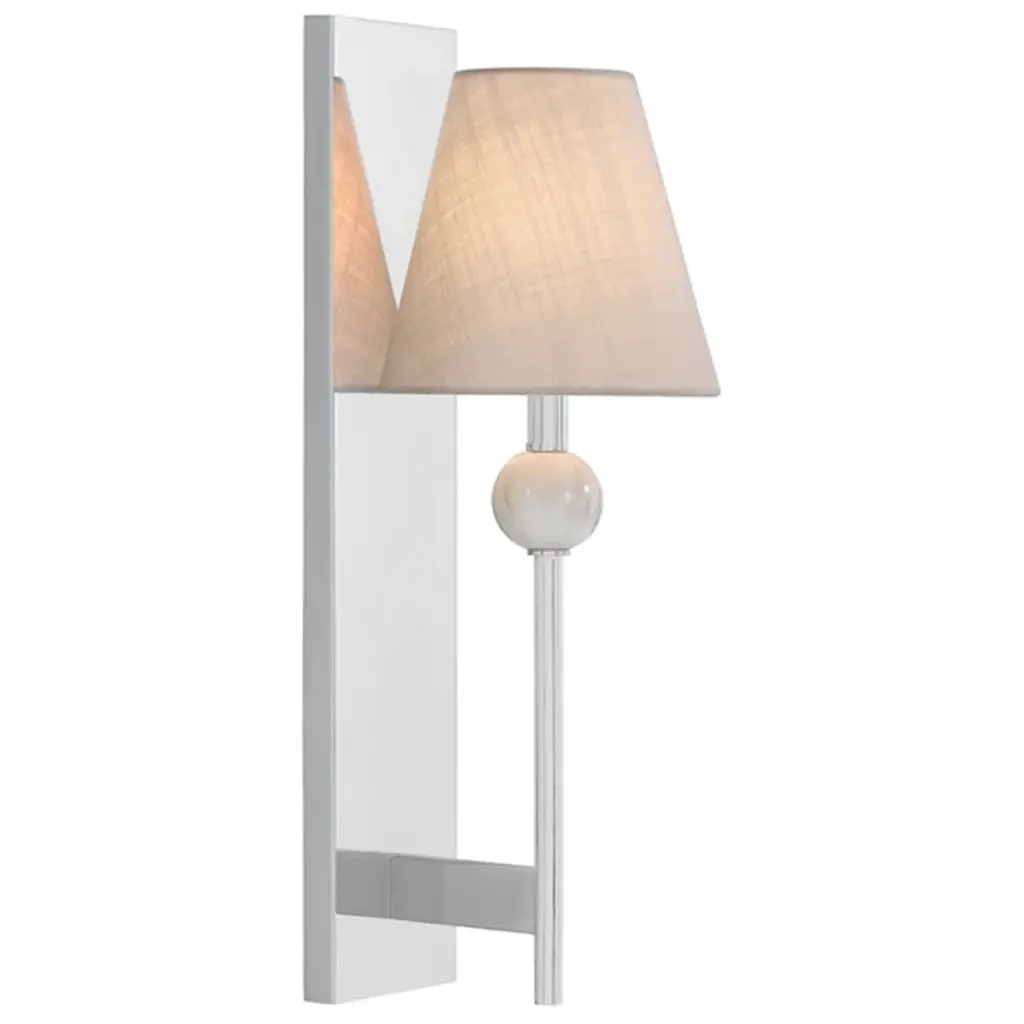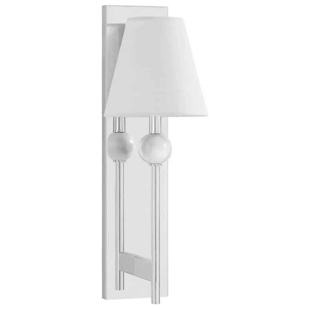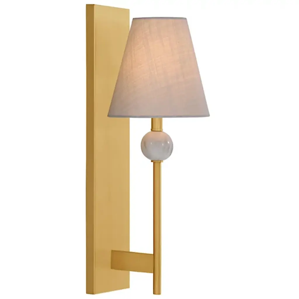 The Travis Wall Sconce from Savoy House is a retro-modern fixture whose sleek metal body is accented by a natural white marble orb with unique dark veining. This striking marble feature stands out from the clean design, while a white fabric shade gently diffuses the candelabra-style lamping, creating a soft, comfortable illumination. This piece adds blends mid-century modern and transitional style, marrying elegance and simplicity for a stylish wall lighting solution.