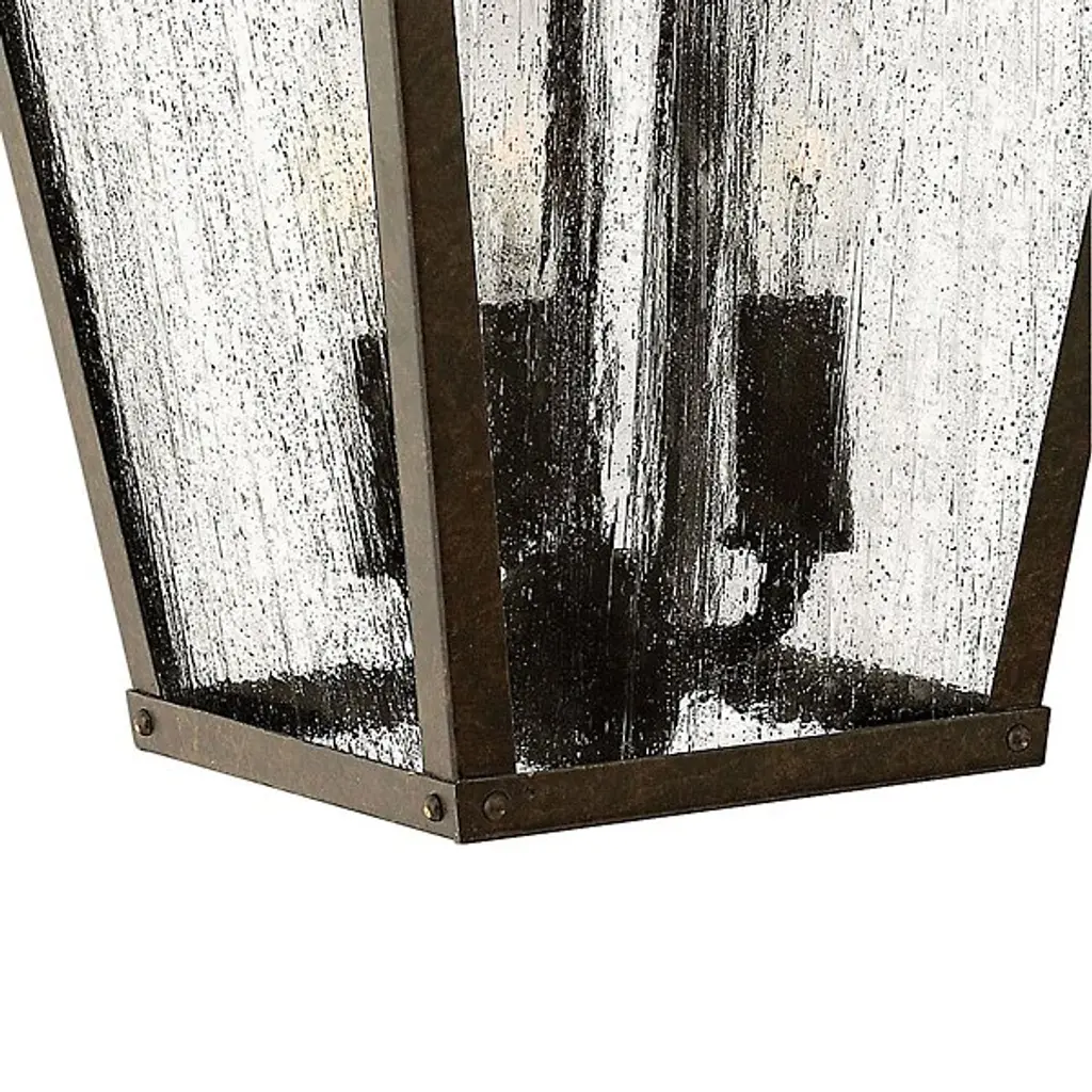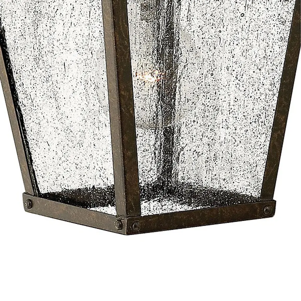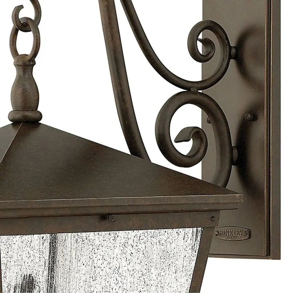 A sconce with all the classic trimmings of a 19th century lamppost. The Trellis Outdoor Wall Sconce by Hinkley Lighting features a tapered clear seedy glass shade framed in Regency Bronze finished aluminum. The body is hooked into place by a highly decorative metal arm that curls and extends from a rectangular wall plate. The light itself is warm, partially diffused, with a noticeable shimmer as it plays off the imperfections in the glass.