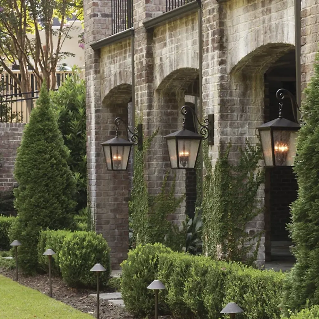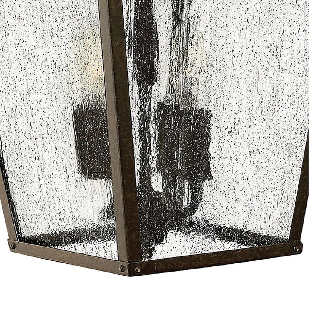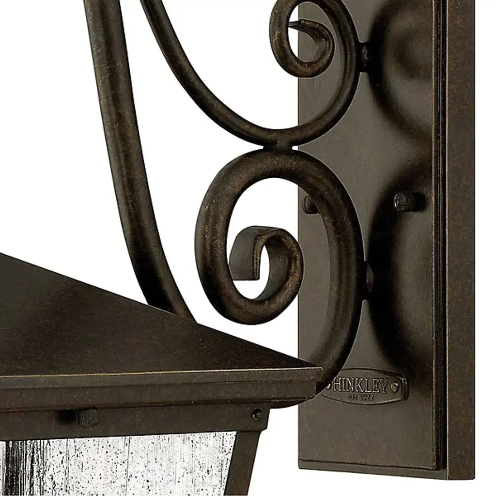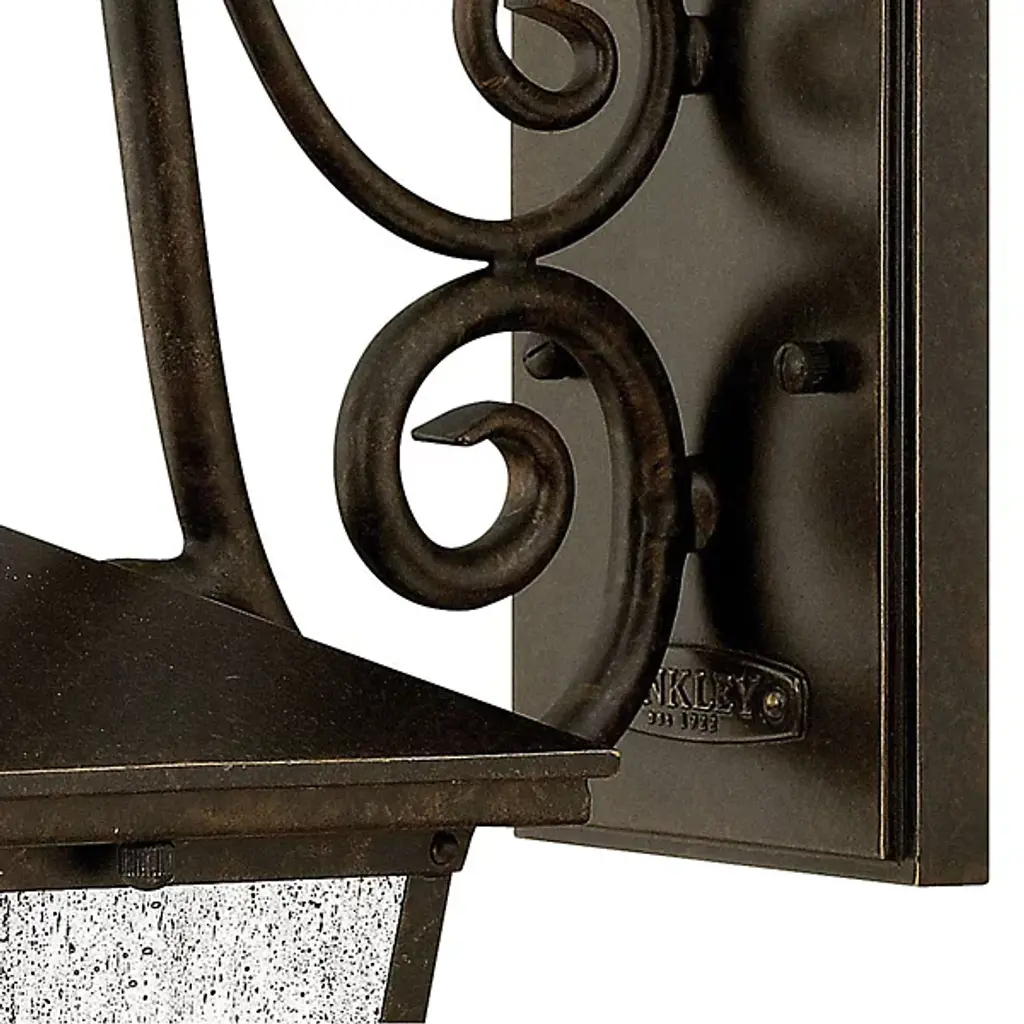 A sconce with all the classic trimmings of a 19th century lamppost. The Trellis Outdoor Wall Sconce by Hinkley Lighting features a tapered clear seedy glass shade framed in Regency Bronze finished aluminum. The body is hooked into place by a highly decorative metal arm that curls and extends from a rectangular wall plate. The light itself is warm, partially diffused, with a noticeable shimmer as it plays off the imperfections in the glass.