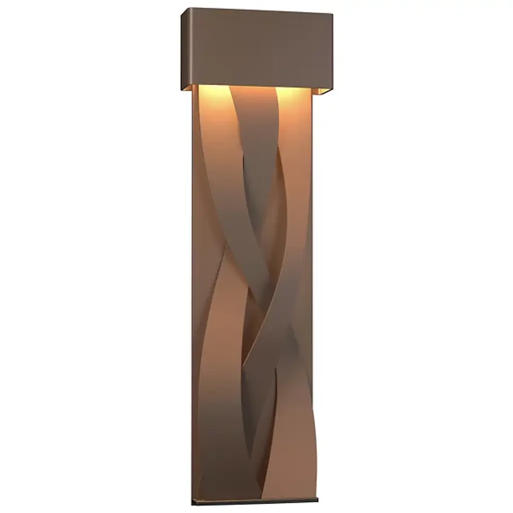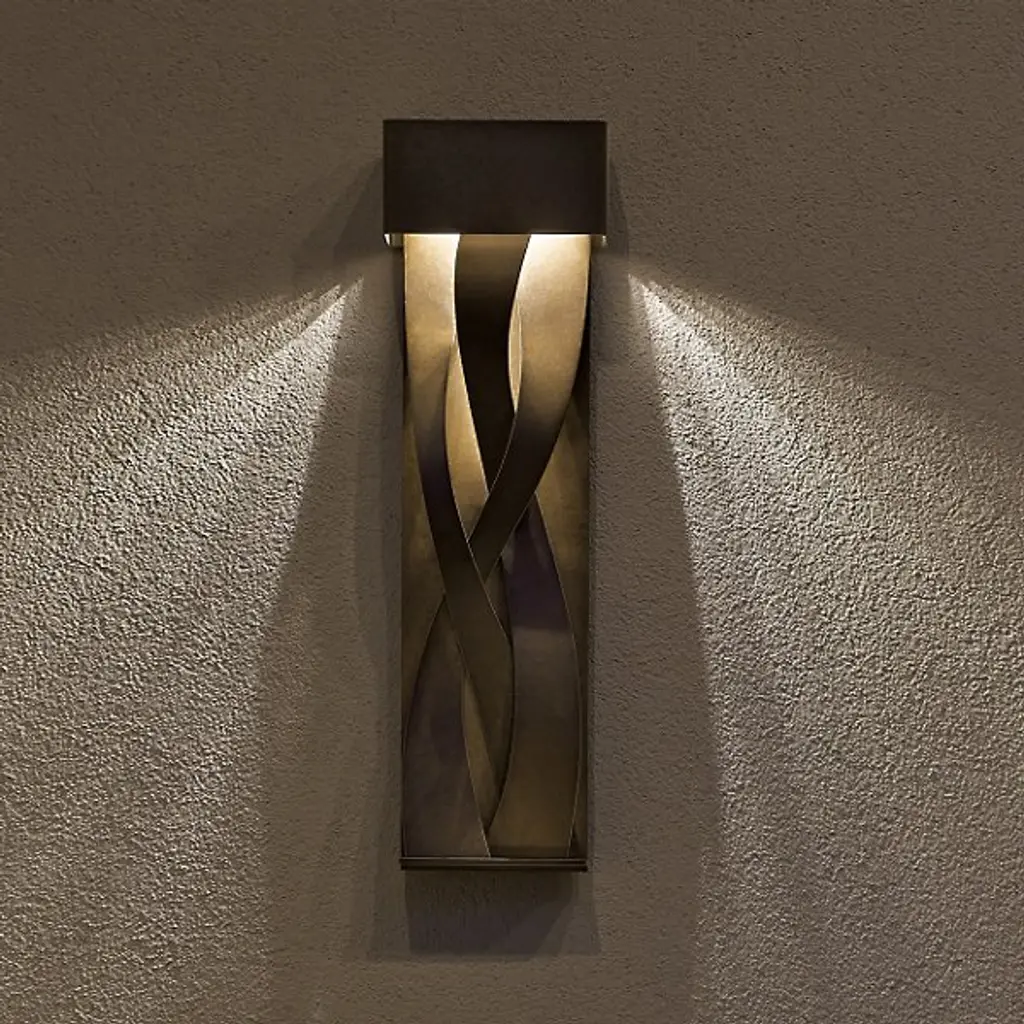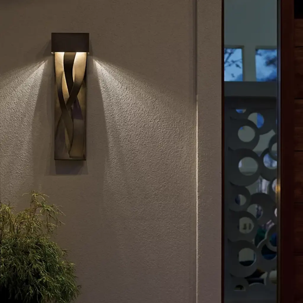 The Hubbardton Forge Tress Coastal Outdoor LED Wall Sconce features a sculptural piece with intertwining metal planes forming a loose braid. The modern energy efficient lighting pours down from the iron shade, casting an intriguing glow on the flowing wrought iron planes. Great for both contemporary or traditional settings, add a little artistic flair to your outdoor living space while also keeping it safe and illuminated. The coastal finishes are meant to endure harsh salt water environments and have been tested to 100% humidity and water with salinity 50% greater than the average found in the Atlantic or Pacific.
