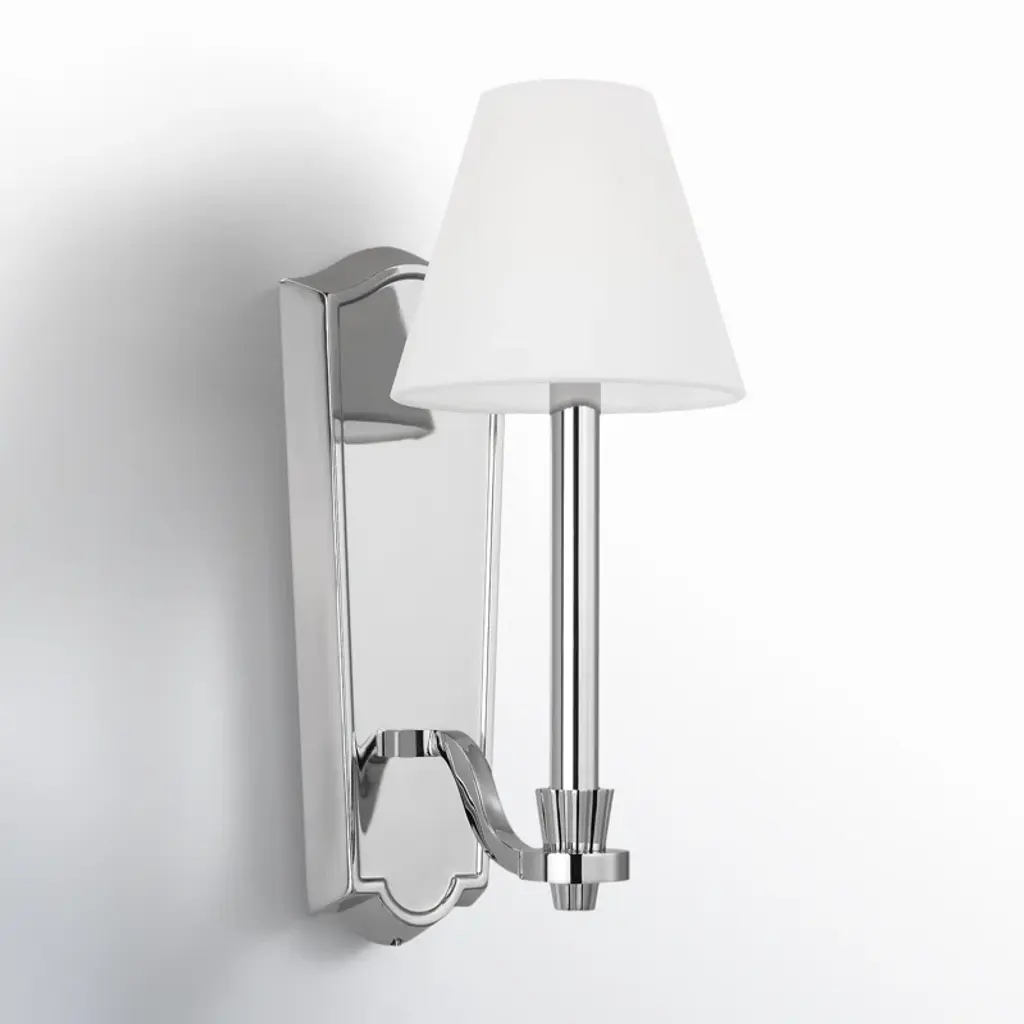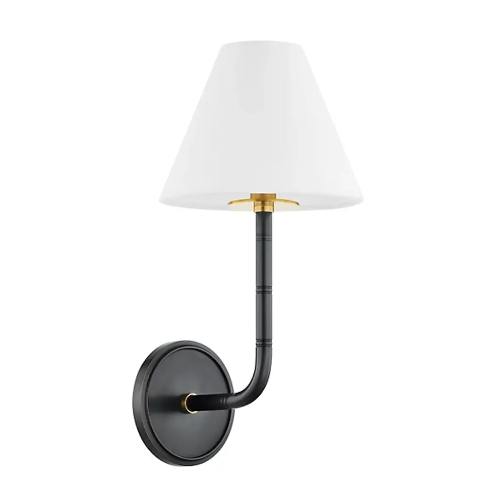 The Trice Wall Sconce is presented by Hudson Valley Lighting. Instantly recognizable and endlessly useable, this familiar sconce form features a tapered white linen shade, a slender curved arm, and a round backplate for a classic, refined look. The subtle bamboo-inspired ribbing in the metalwork gives a nod to the natural and draws the eye.