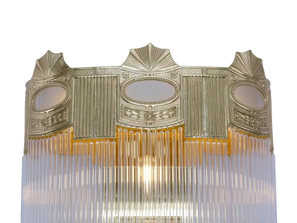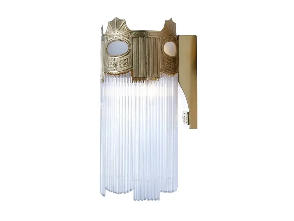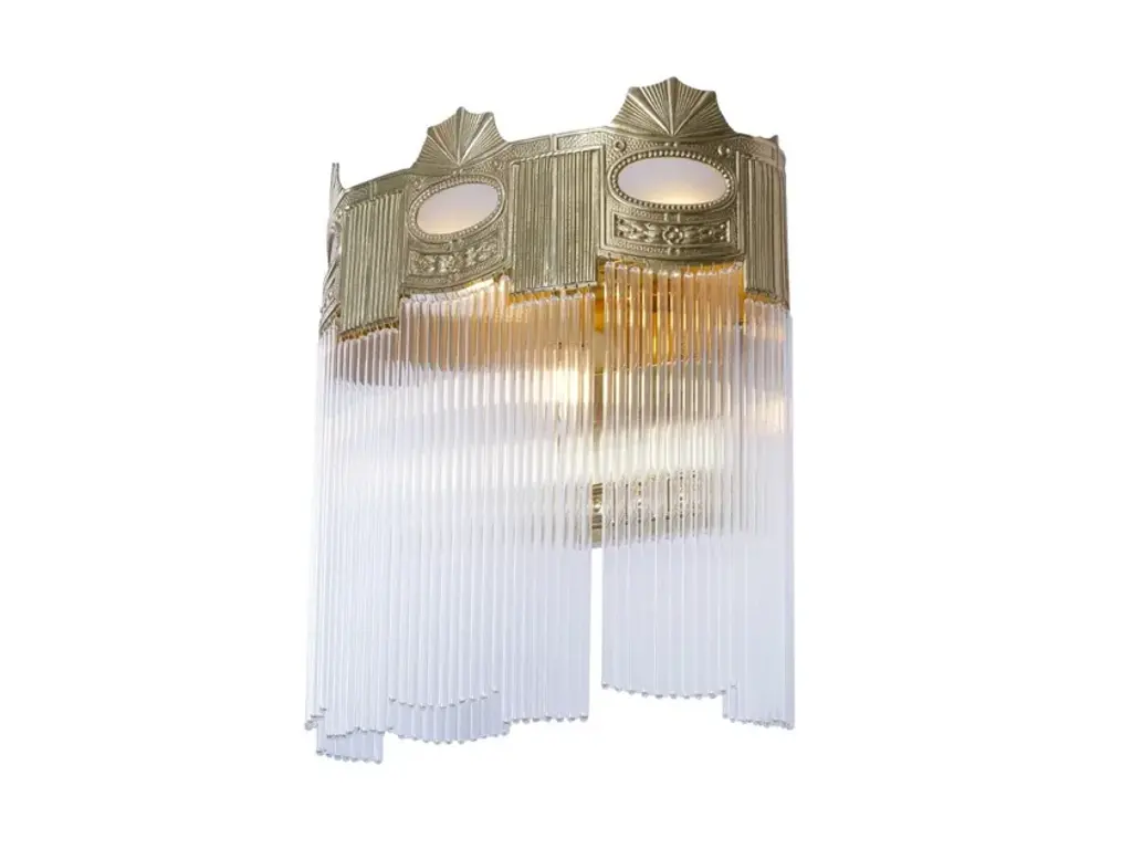 Triest IV is a wall lamp made of brass available in different finishes.Finishes: Antique, Shiny brass, Matt brass, Shiny nickel, Matt nickelCapacity: max. 3x60W E14This marvellous collection could be a perfect set lighting for a fairy tale feature. All lamps are richly adorned, some even feature a coloured glass decor. The glass tubes are not only used as diffusers,but they can be found on the structure itself as well, thus giving the lamp even more magic.