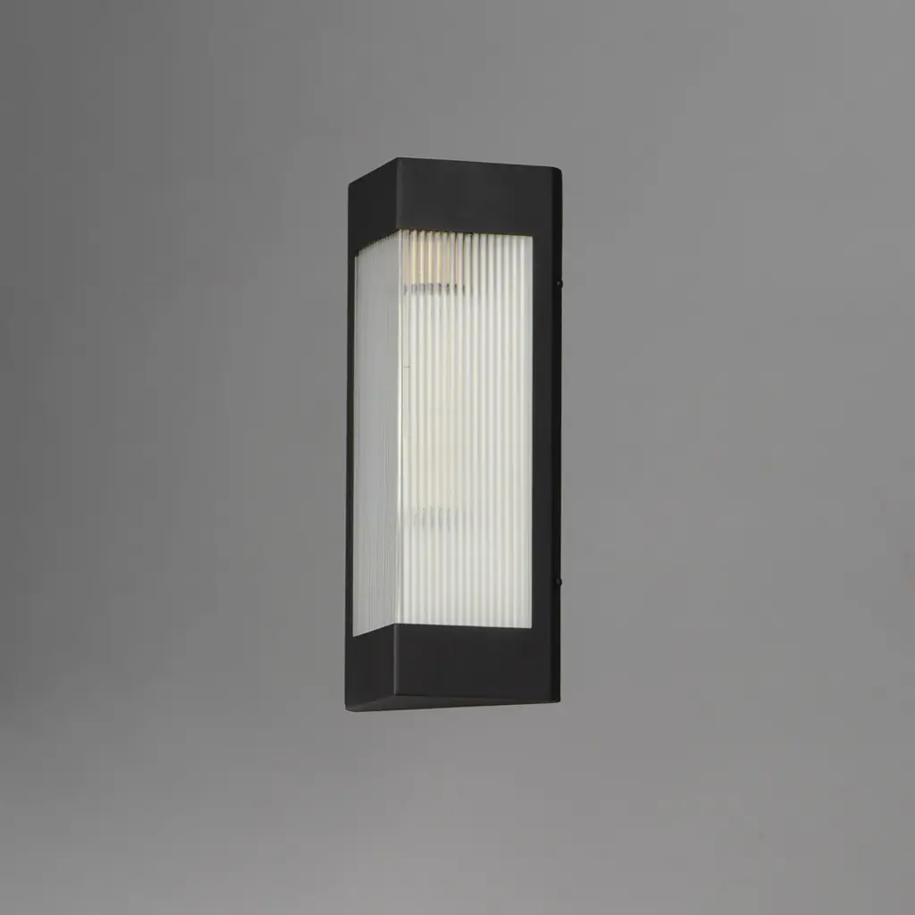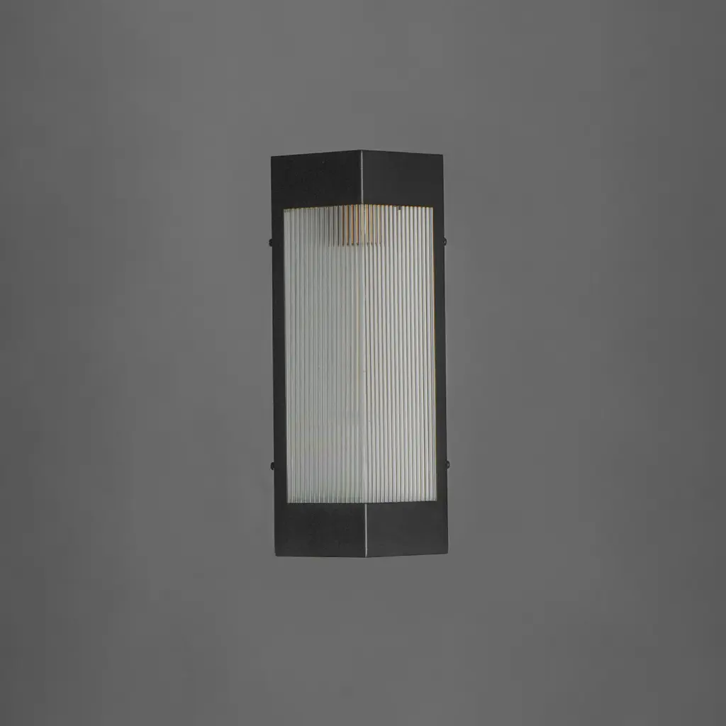 A transitional design suitable for both modern and more traditional applications, this outdoor series of lighting features Clear Ribbed glass that refracts the light source within triangular frames. A Black frame with warm Antique Brass light clusters within, the collection includes 3 sizes of wall sconces and 2 sizes of outdoor rated pendants. With a depth of less than 4 inches, this ADA compliant sconce may also be used in commercial applications.