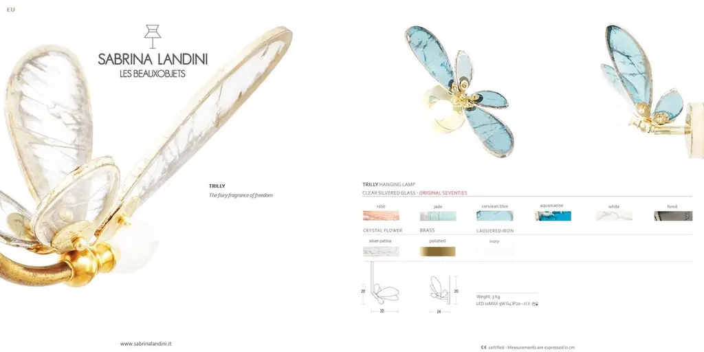 TRILLY The fairy fragrance of freedomThe traditional know-how of our workshop dances to the rhythm of our creative days. Discover the story of the Maison Sabrina Landini, punctuated by originality, crafted by Italian savoir-faire and inspired by timeless shapes and colors. Here beats the heart of a living heritage, that of craftsman-ship.Small and ethereal, Trilly, the little sister of our Butterfly, brings fresh allure to home décor.Capture your dream and let your imagination soar with Trilly, symbol of joy, optimism and wonder, inspired by the sense of freedom. Trilly, with multiply directions, seems to take flight with breathtaking colored wings. To highlight traditional handworks, this magnificent creation features hand-cut glass, sprinkled across silvered tones spanning over its surface irregularly with the polished brass body. An artful blend of the iconic collection Sabrina Landini, well known for the innovative creativity. Something brilliant awaits, experience Trilly! Available in a wide range of silvered glass colors:crystal silvering, jade, rose, sun, black, smoky grey, aquamarine, blue.CE certified and Electrified: US, EU, UK, 1x G4 lamp holder, dimmable
