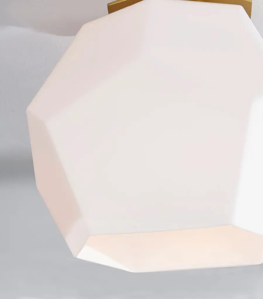 Tring's whimsical shade shape draws the eye and sparks the imagination. Gem-like, asymmetrical opal matte glass shades extend from sleek geometric metal work, creating stunning bursts of light when lit. A multifaceted work of art, Tring is available as a 4-light wall sconce, 1-light flush mount, or 13-light chandelier.