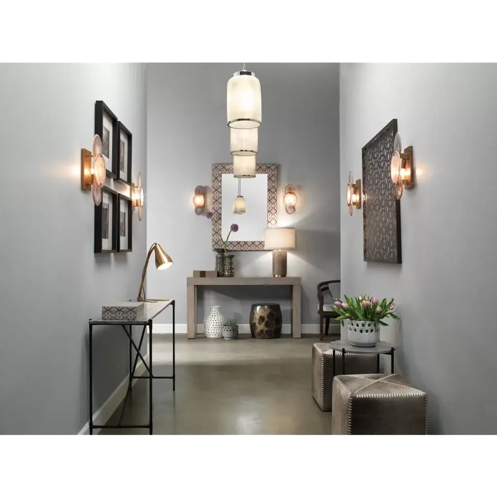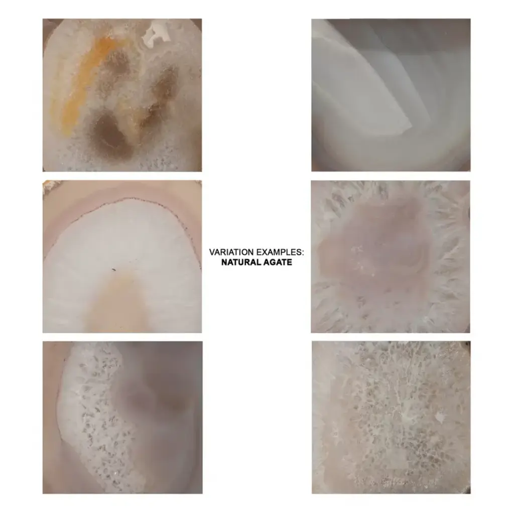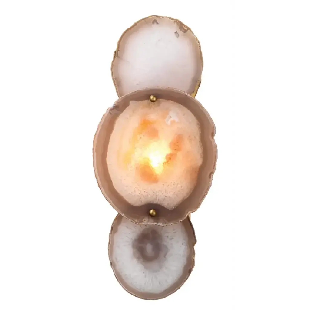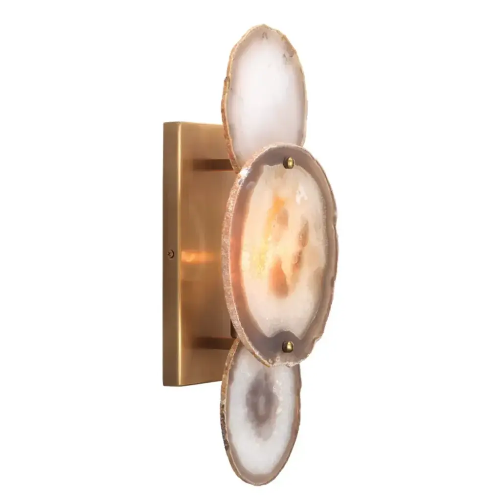 Embrace this wall sconce's individuality and you will have a truly one-of-a-kind piece on your wall. Unique slices of natural agate stones are individually arranged and anchored by a hand-finished steel plate. Place a pair on either side of a mantel or bed to beautifully illuminate a room.