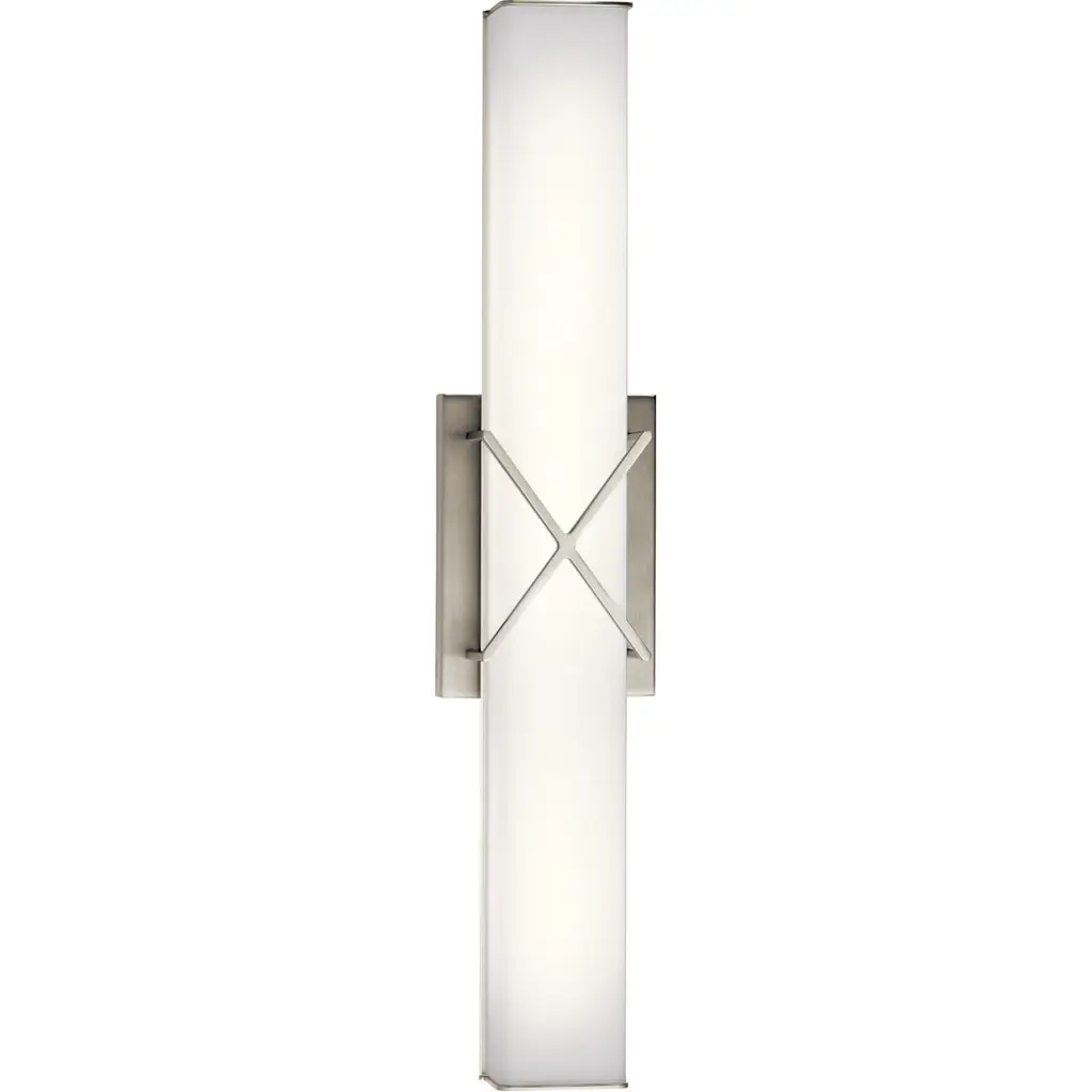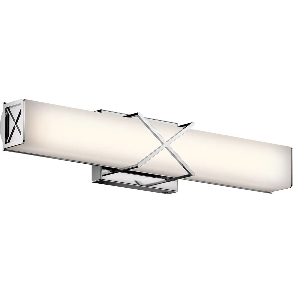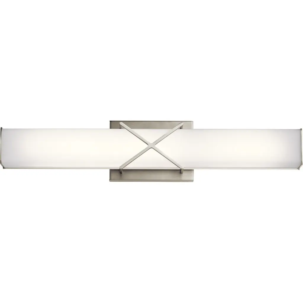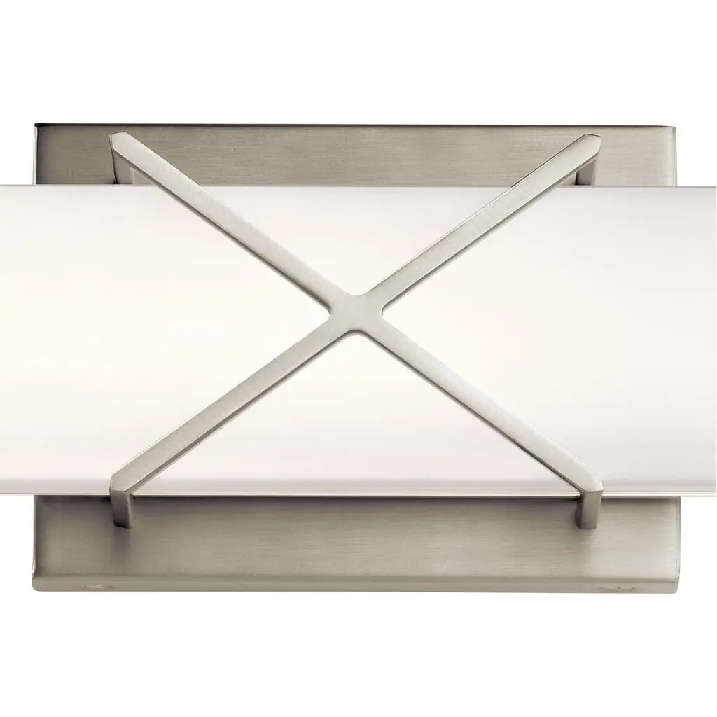 The 22in. LED bath light of the Trinsic(TM) collection is an intricate, yet subtle aesthetic to complement any modern bath with Satin Etched White glass and a unique criss-cross design in a Nickel finish.
