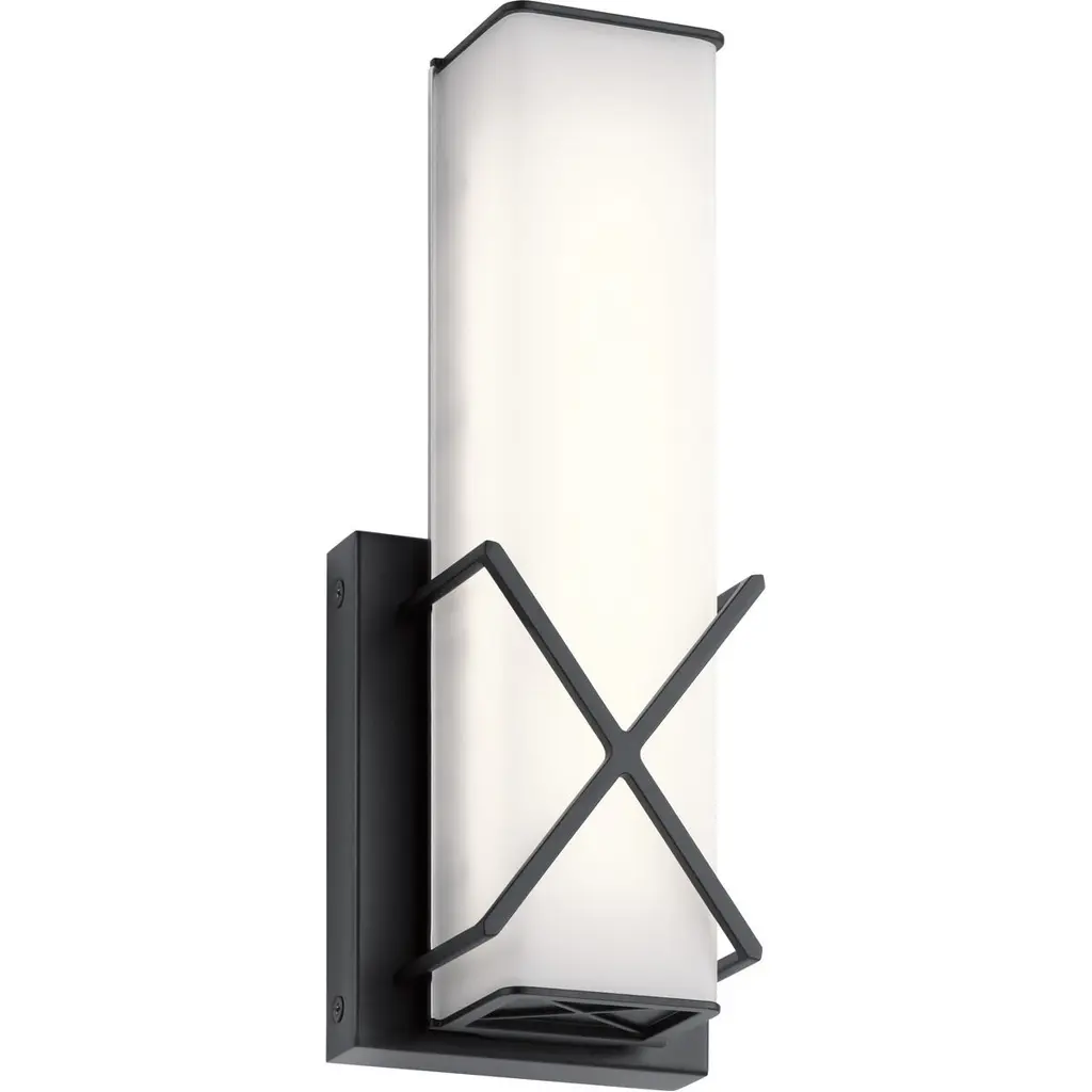 The LED Wall Sconce of the Trinsic(TM) collection is an intricate, yet subtle aesthetic to complement any modern bath with Satin Etched White glass and a unique criss-cross design in a Nickel finish.