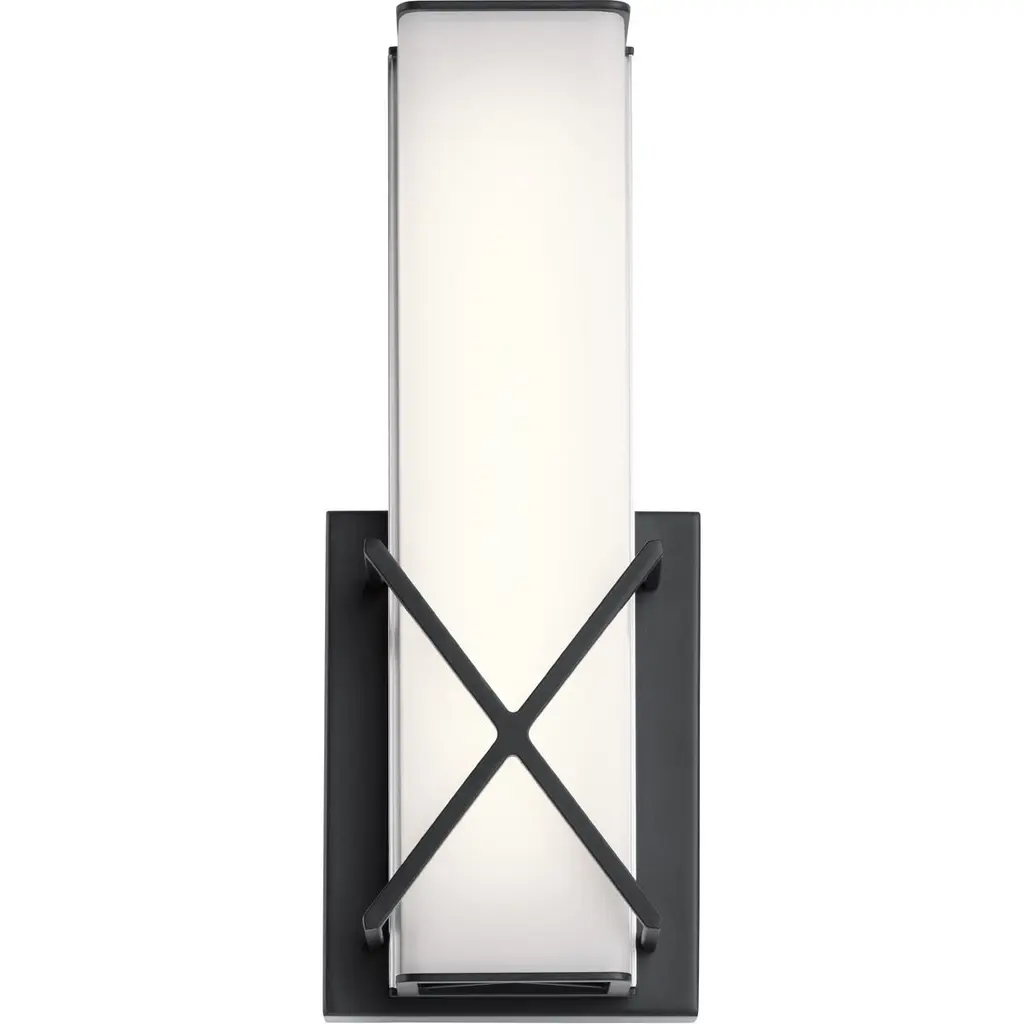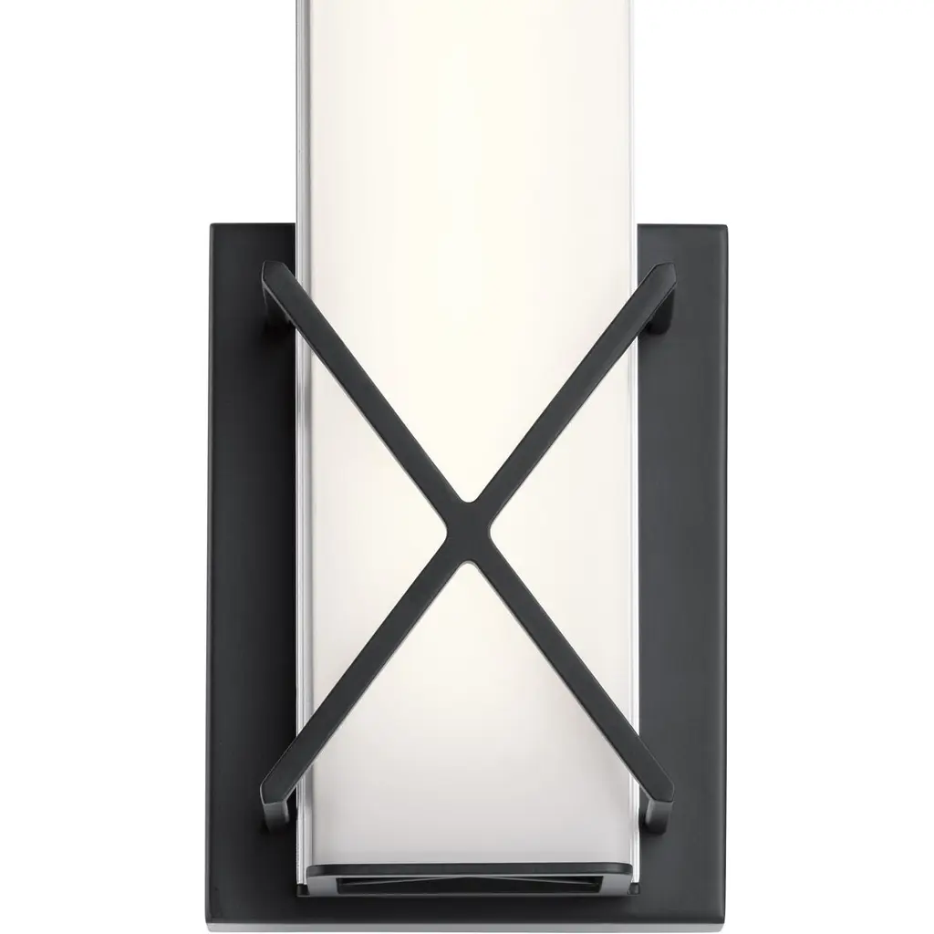 The LED Wall Sconce of the Trinsic(TM) collection is an intricate, yet subtle aesthetic to complement any modern bath with Satin Etched White glass and a unique criss-cross design in a Matte Black finish.