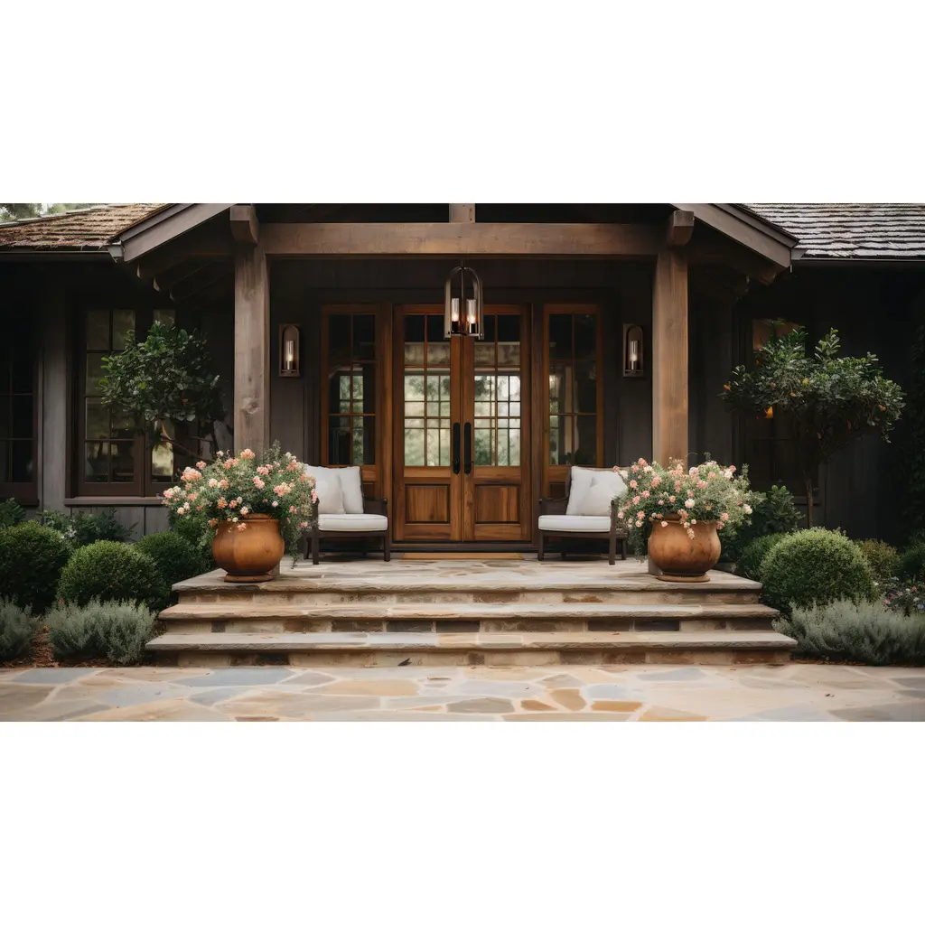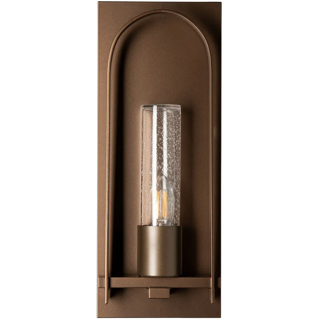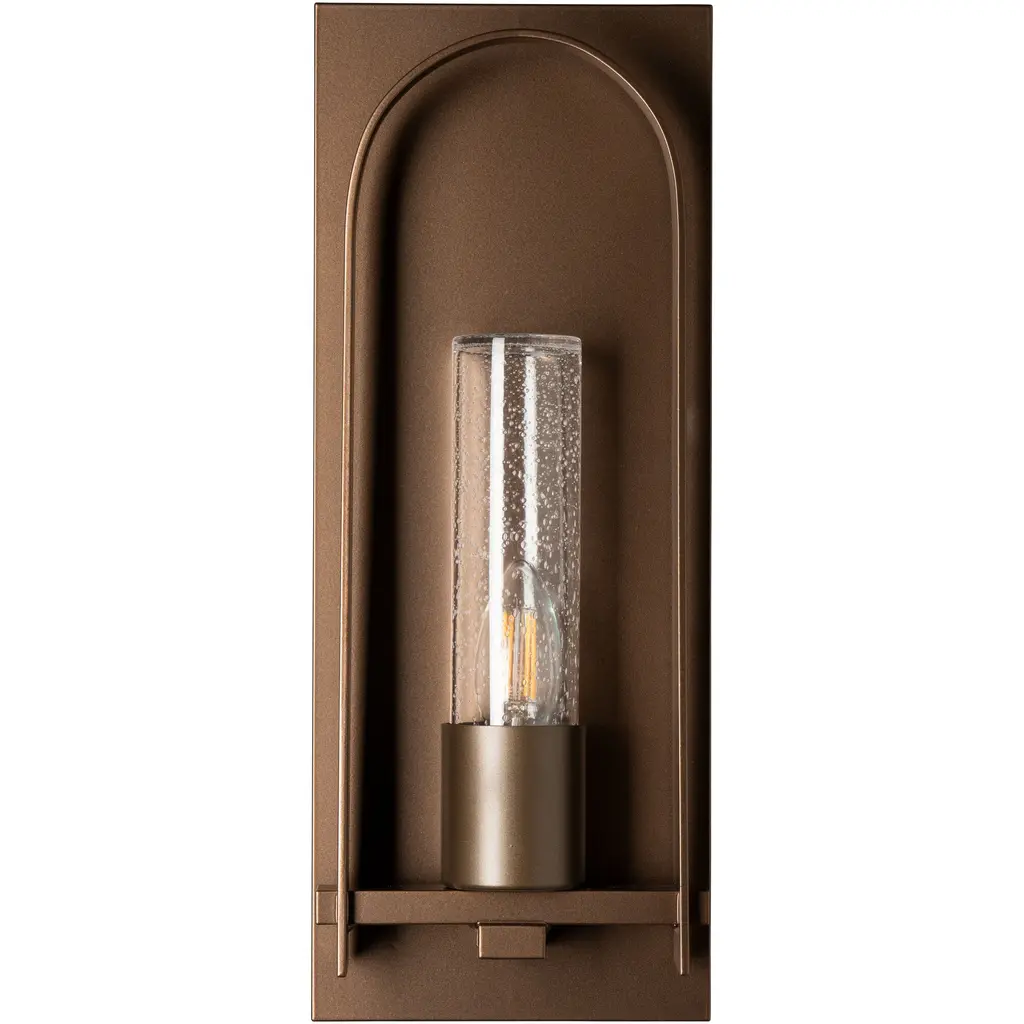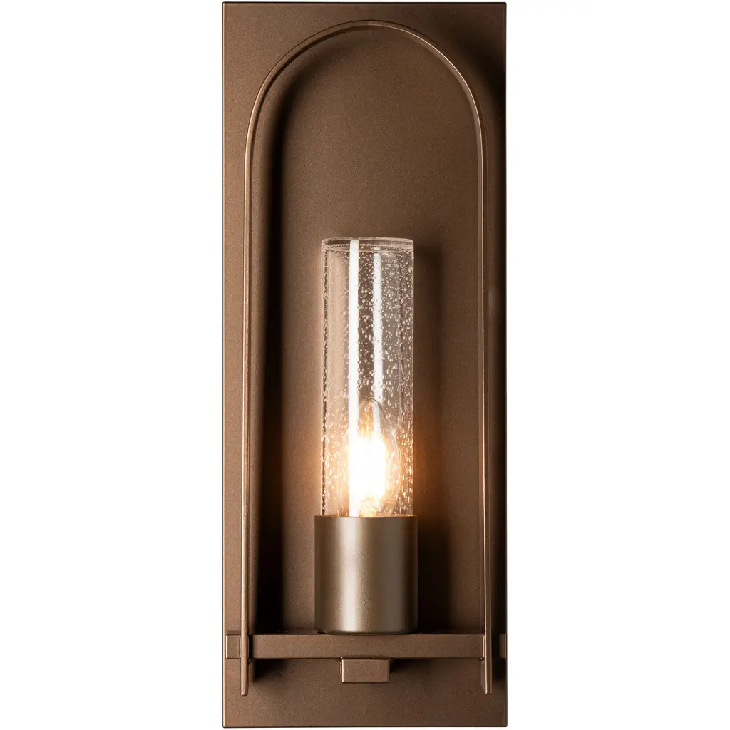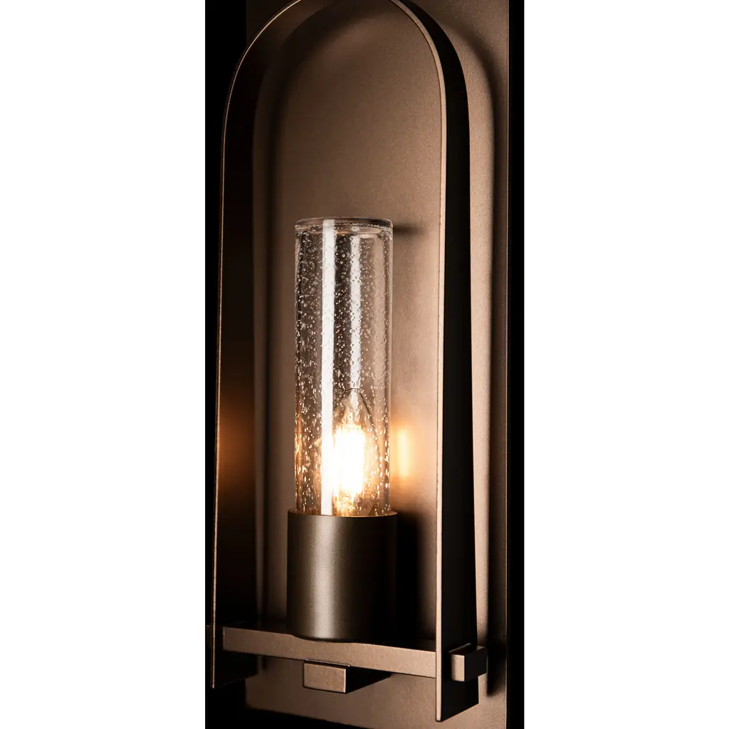 The Triomphe Small Outdoor Sconce is 16” in height and features this collection’s trademark handcrafted classical arch with craftsman tenon details on an aluminum backplate, as designed by David Martin. Available with clear seeded or opal glass cylindrical shade and a selection of robust AAMA-rated Coastal Outdoor Finishes.