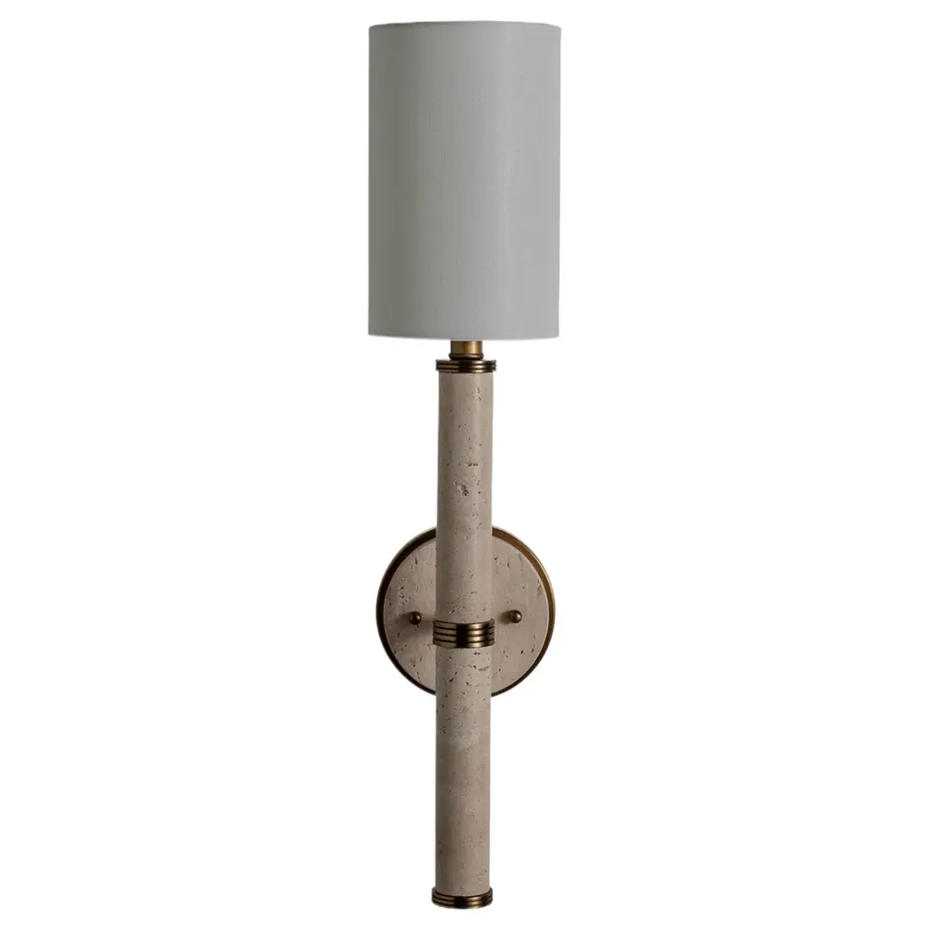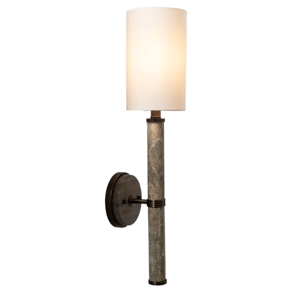 Mid-century, yet classic styled narrow column sconce featuring natural marble turnings joined with ribbed turning hardware. This sconce requires a 40 watt max Type B chandelier bulb, which is not included, and is hardwired. It measures 22"H x 5"D, with the fixture extending 6.5" from the wall to the outside of the shade. The metal back plate has a 5" diameter. The shade is a 5” x 5” x 8”SH round drum hardback clip shade with soft rolled edge trim, made from light beige polyester fabric, and includes a brass clip spider. The shade is included with the sconce fixture. Materials used are metal/steel and natural marble stone.