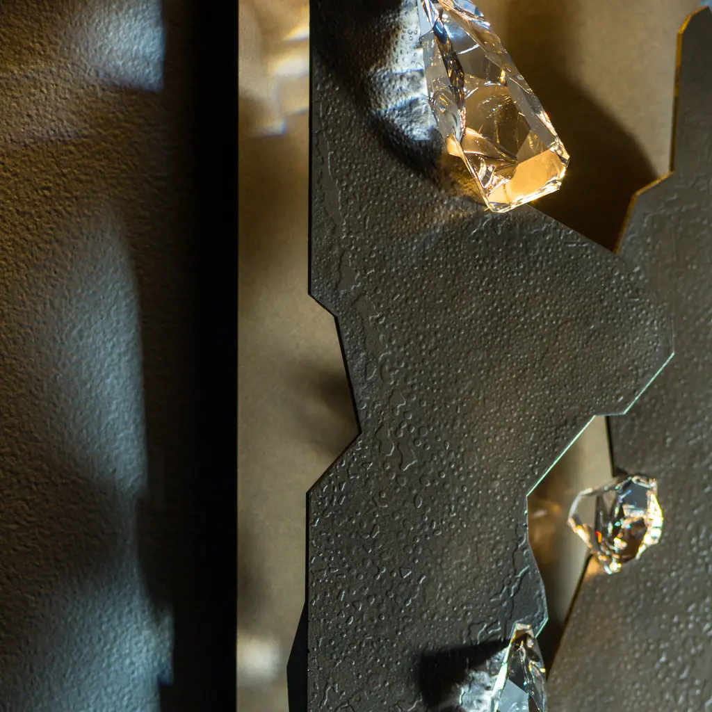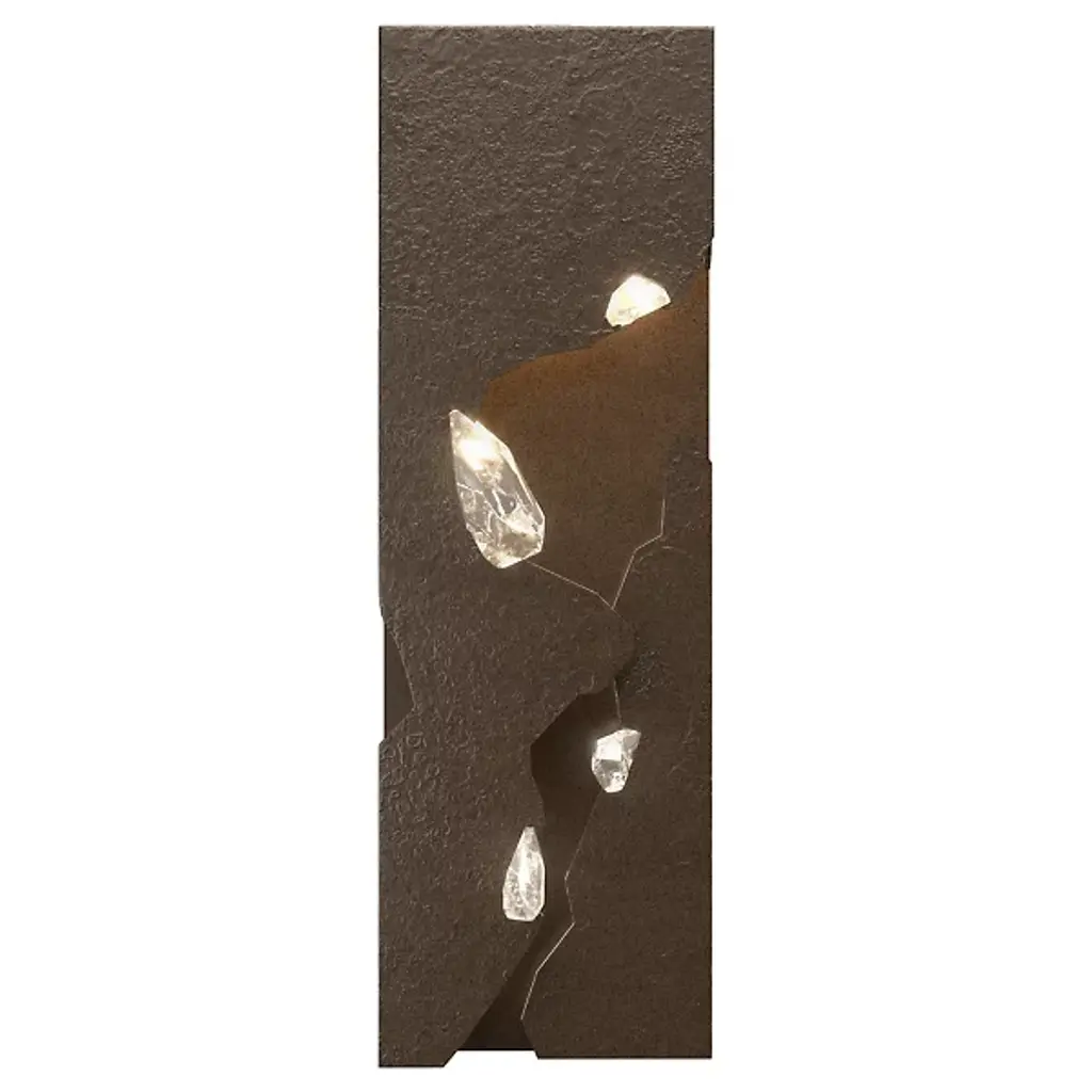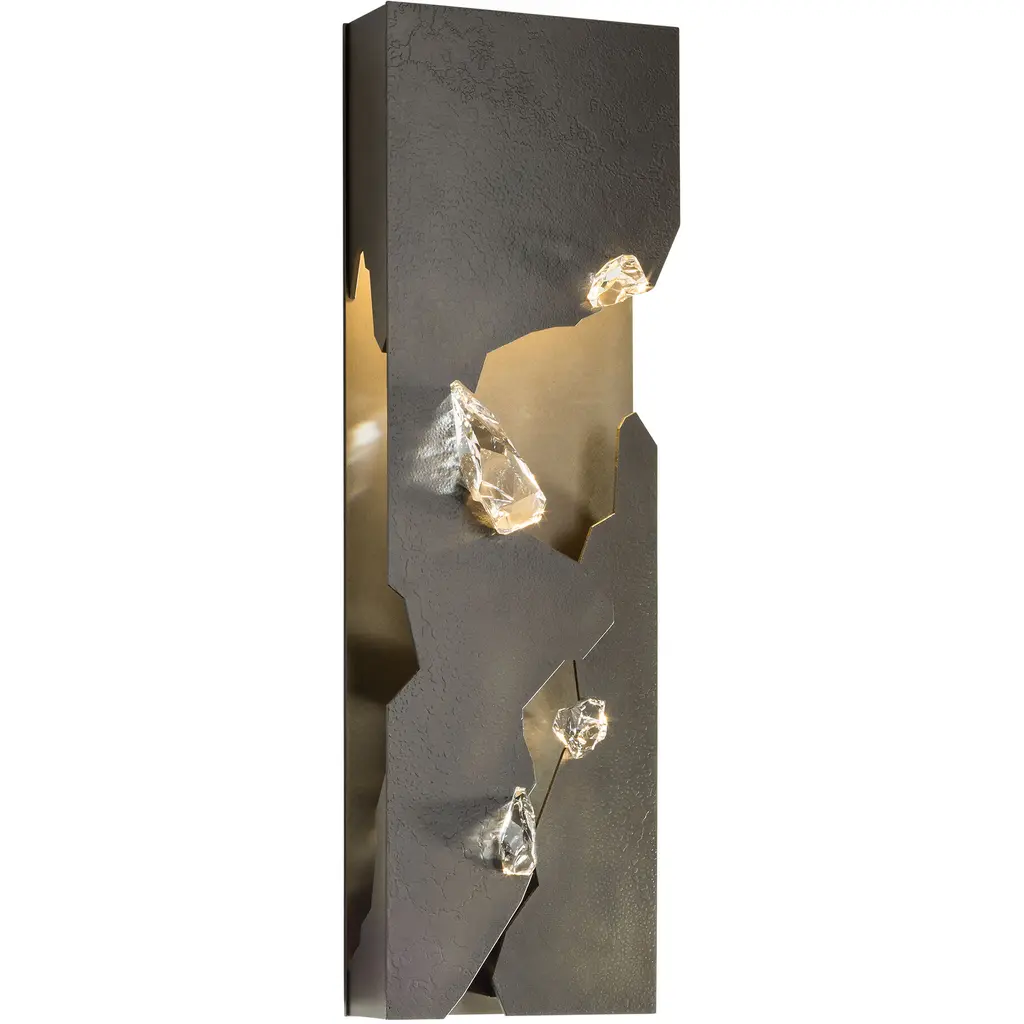 Both visually rich and dramatic, the Trove sconce interchanges points of jeweled light and planes of textured steel. Inspired by crystal in raw form, the featured crystal resembles treasure buried in its steel mountain.