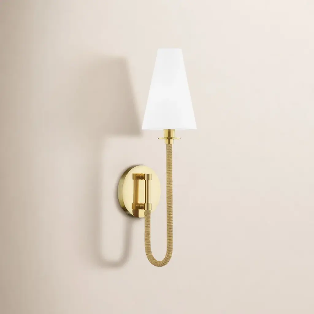 Collection: Magnus, Material: Steel, Finish Color: Gold, Width: 5", Height: 25.5", Length: 8", Depth: 8", Lamping Type: Incandescent, Number Of Bulbs: 1, Wattage: 40 Watts, Dimmable: Yes, Moisture Rating: Damp Rated, Desc: At over two-feet tall, Magnus is great in stature and high in style. A metal ring extends from the backplate to hold a ringed metal rod that supports a white linen tapered shade. Whether flanking a fireplace, alongside a headboard or lining a hallway, Magnus has a commanding presence that demands to be noticed. Metal ring extends to hold fixture off the wall White linen shade Tall elegant design.,