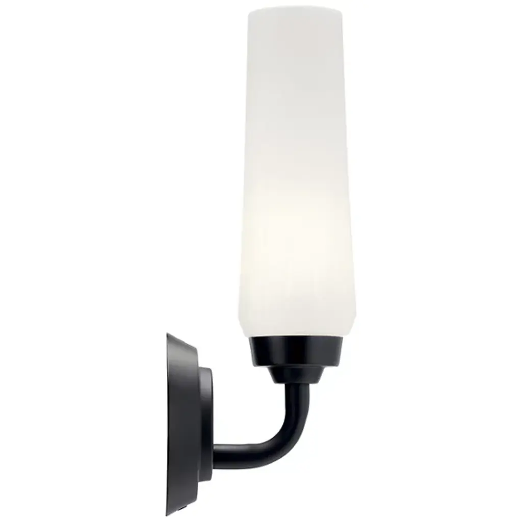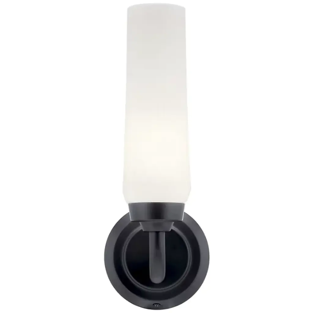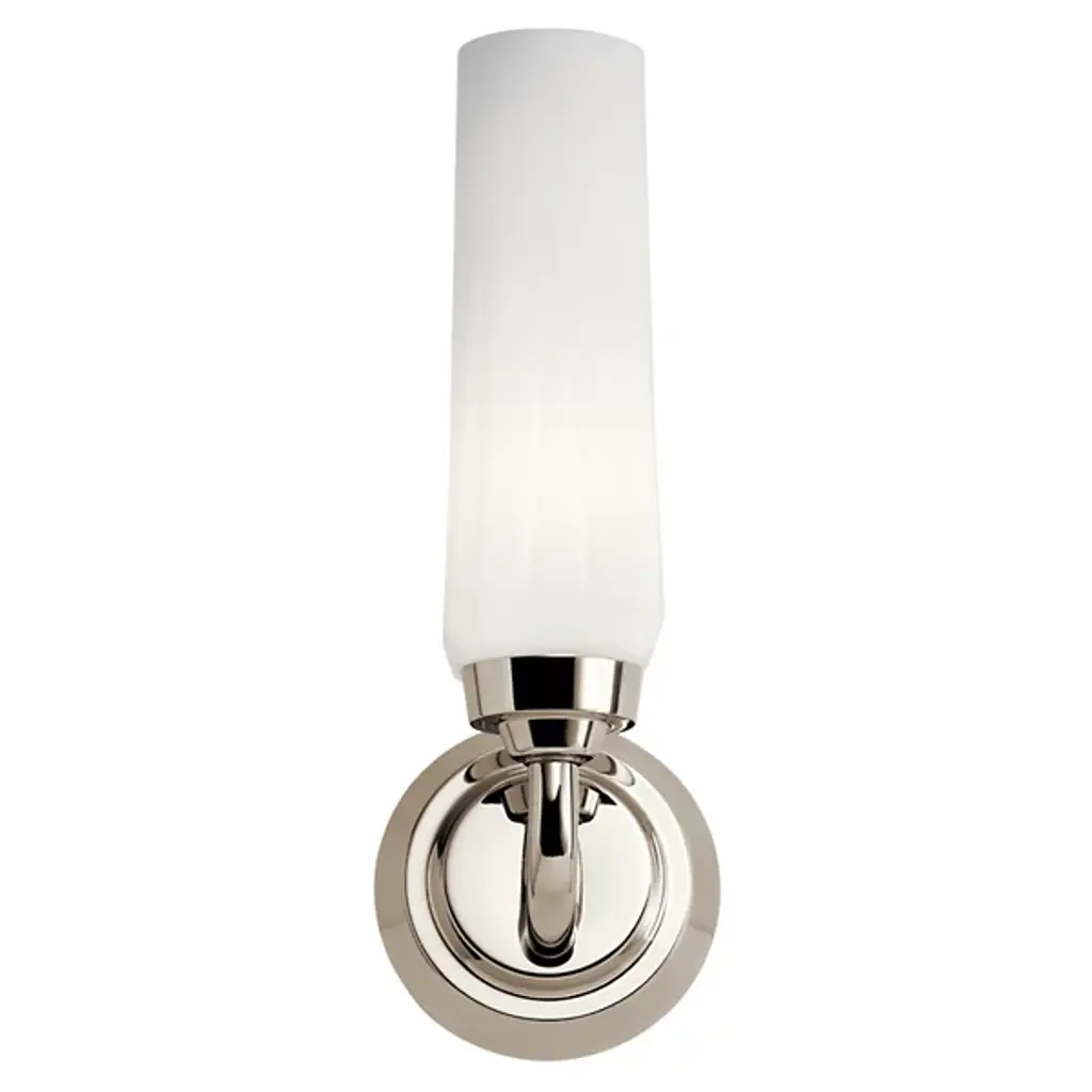Light up your halls with the Truby Wall Sconce by Kichler. A disc-shaped backplate secures to your wall, allowing a steel arm to bolster a shade of opal glass. Incandescent light fills this shade with ease and diffuses light throughout your environment. When paired with an ELV dimmer, create a relaxing atmosphere by dimming your sconce’s light. This light fixture stays properly held in place so that your most often-used walkways and living spaces are routinely illuminated.