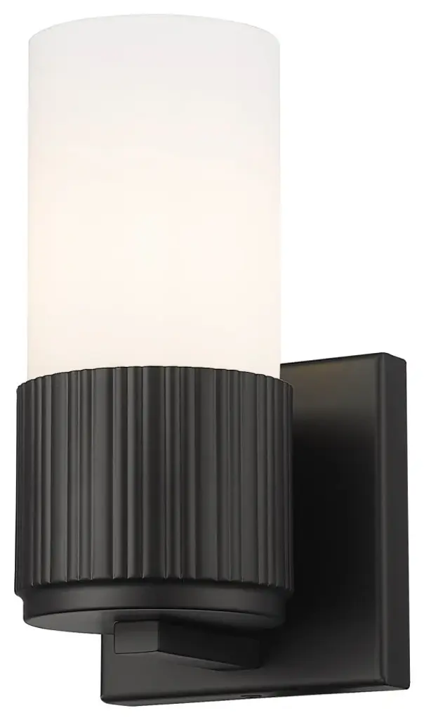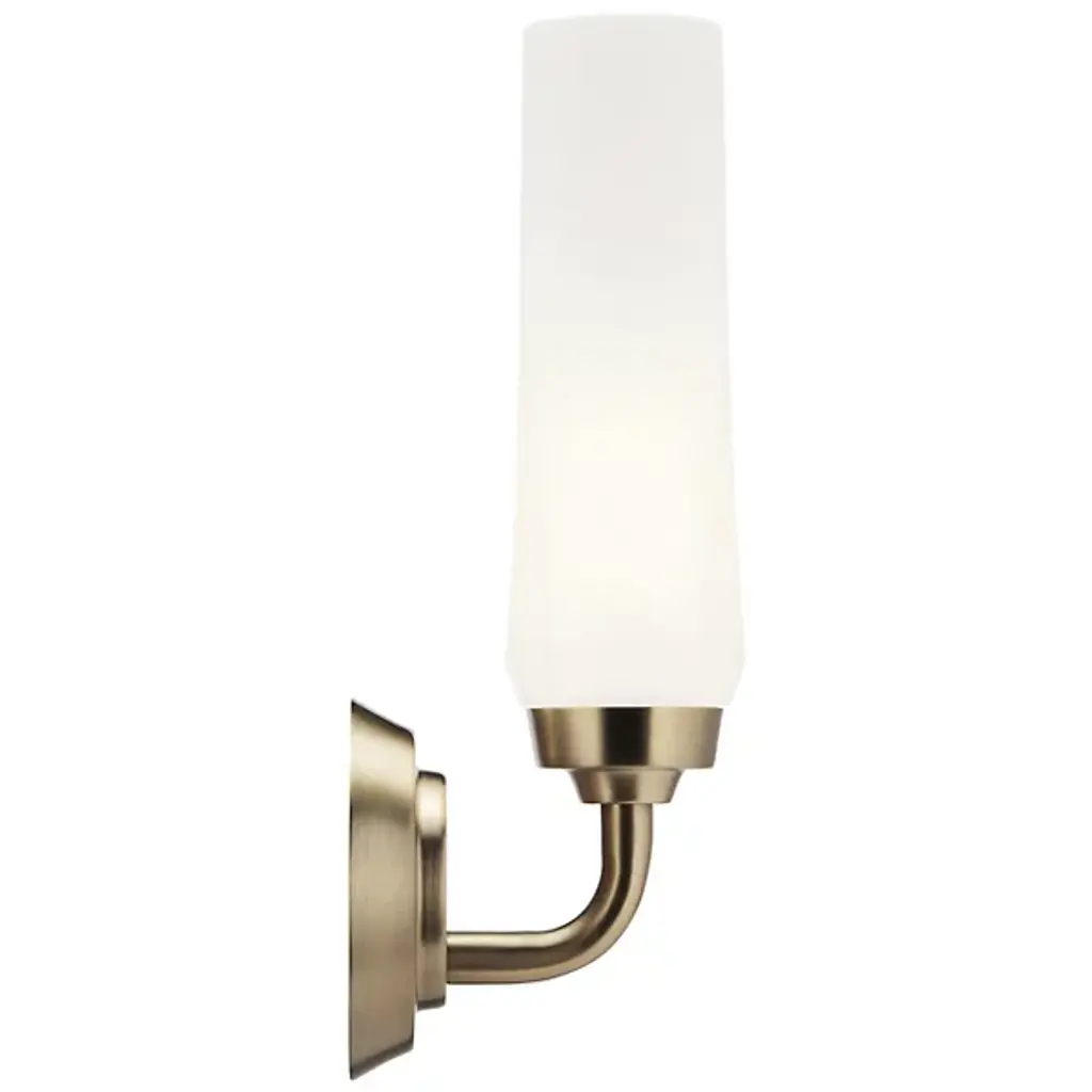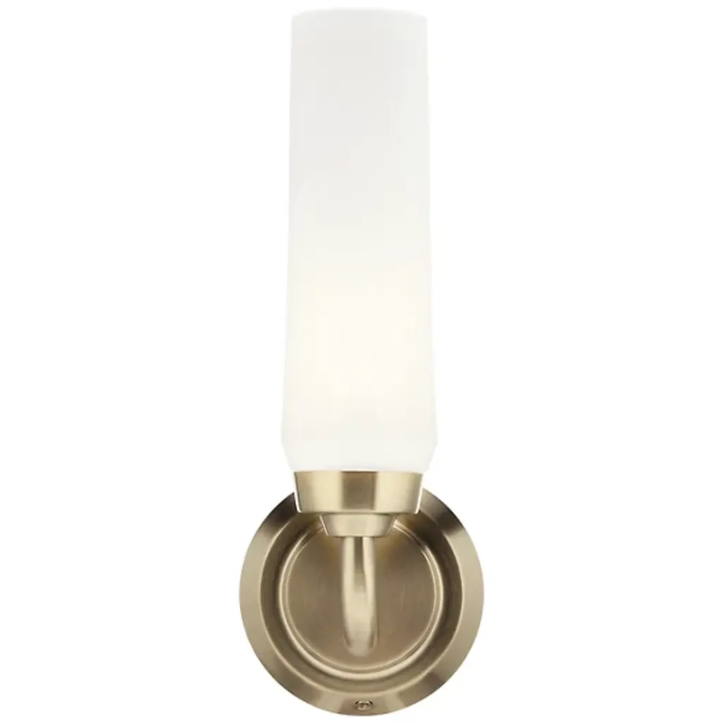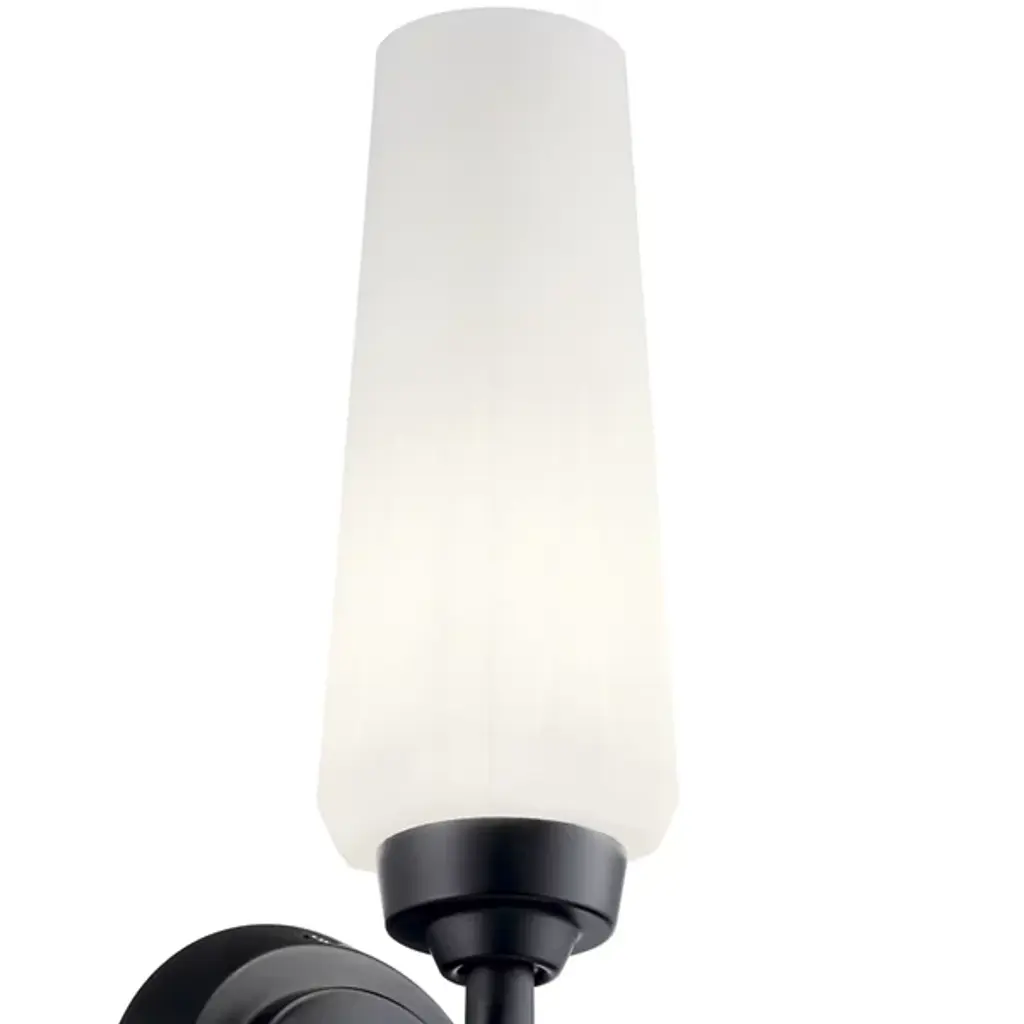 Light up your halls with the Truby Wall Sconce by Kichler. A disc-shaped backplate secures to your wall, allowing a steel arm to bolster a shade of opal glass. Incandescent light fills this shade with ease and diffuses light throughout your environment. When paired with an ELV dimmer, create a relaxing atmosphere by dimming your sconce’s light. This light fixture stays properly held in place so that your most often-used walkways and living spaces are routinely illuminated.