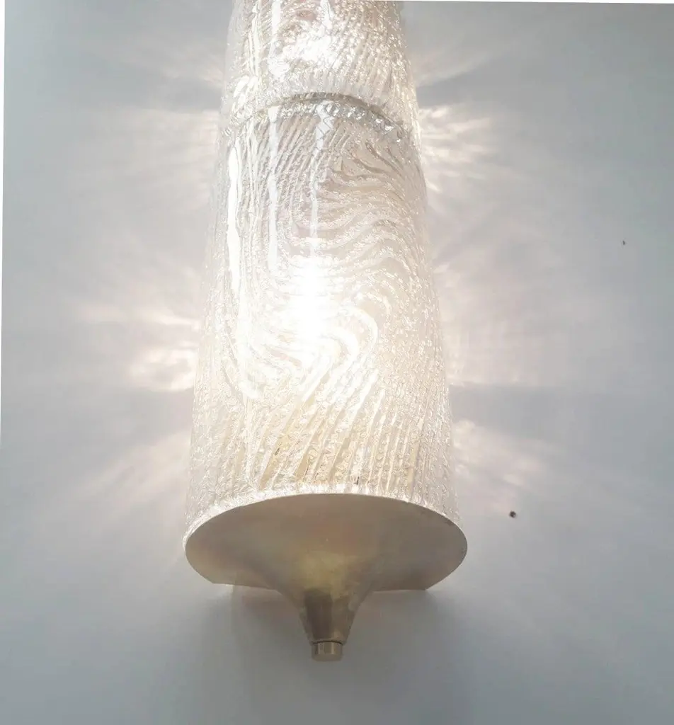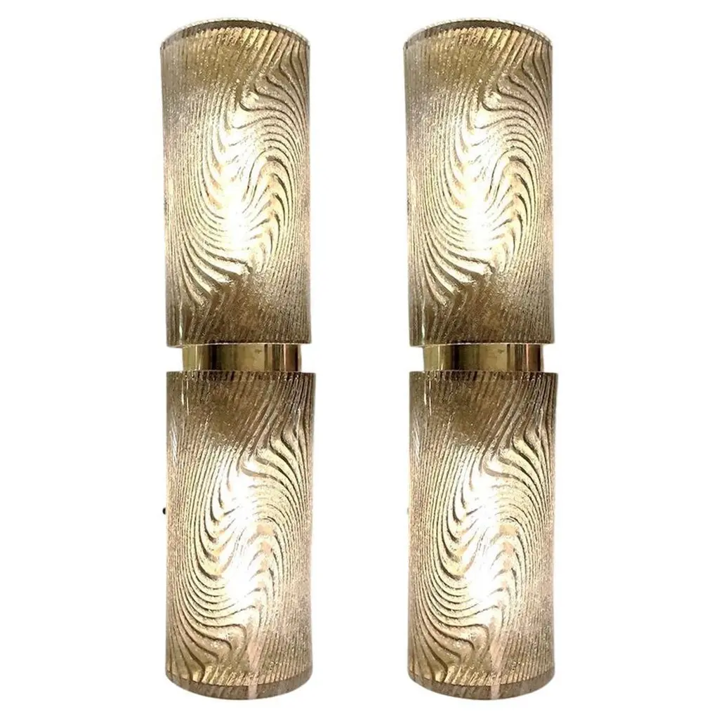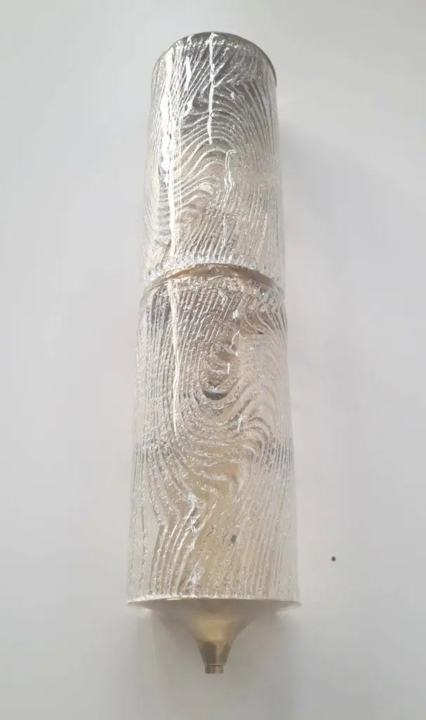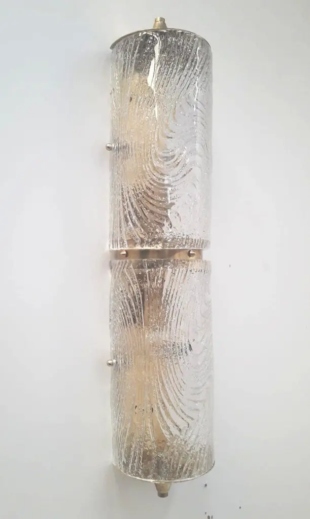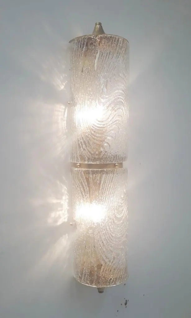 Italian wall light or flush mount with clear Murano glass hand blown into cylinder shaped diffusers with textured patterns and granular effect using Graniglia technique, mounted on full brass back-plate with decorative brass caps / Designed by Fabio Bergomi for Fabio Ltd / Made in Italy2 lights / E26 or E27 type / max 60W eachMeasures: Height 27 inches / Width 5.5 inches / Depth 5 inchesOrder Only / This item ships from ItalyPlease inquire for custom options / pricing / current lead timesOrder Reference #: FABIOLTD W448