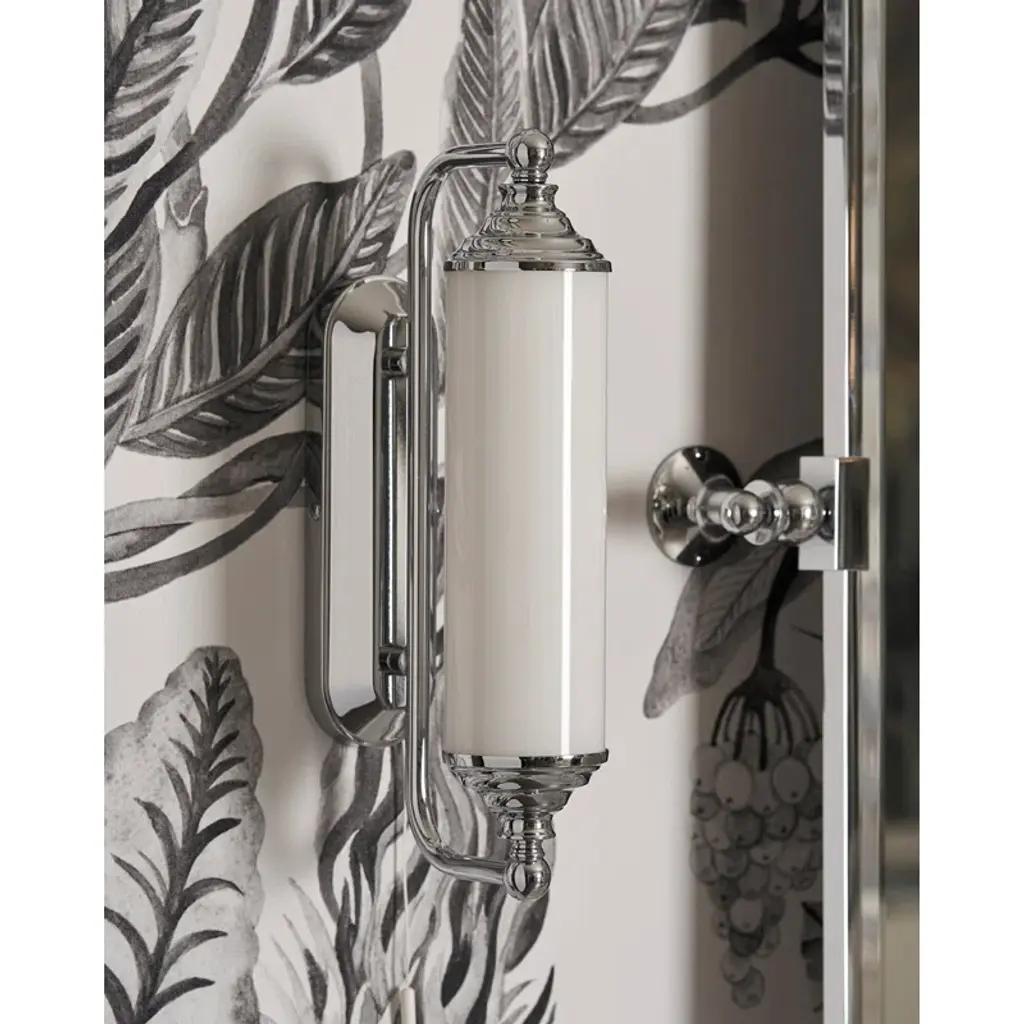 This sophisticated wall lamp is a homage to the great American design of the Thirties, it gives an inimitable retro taste to very elegant bathrooms. The diffuser is made of satin glass, the metal structure is in brass.
