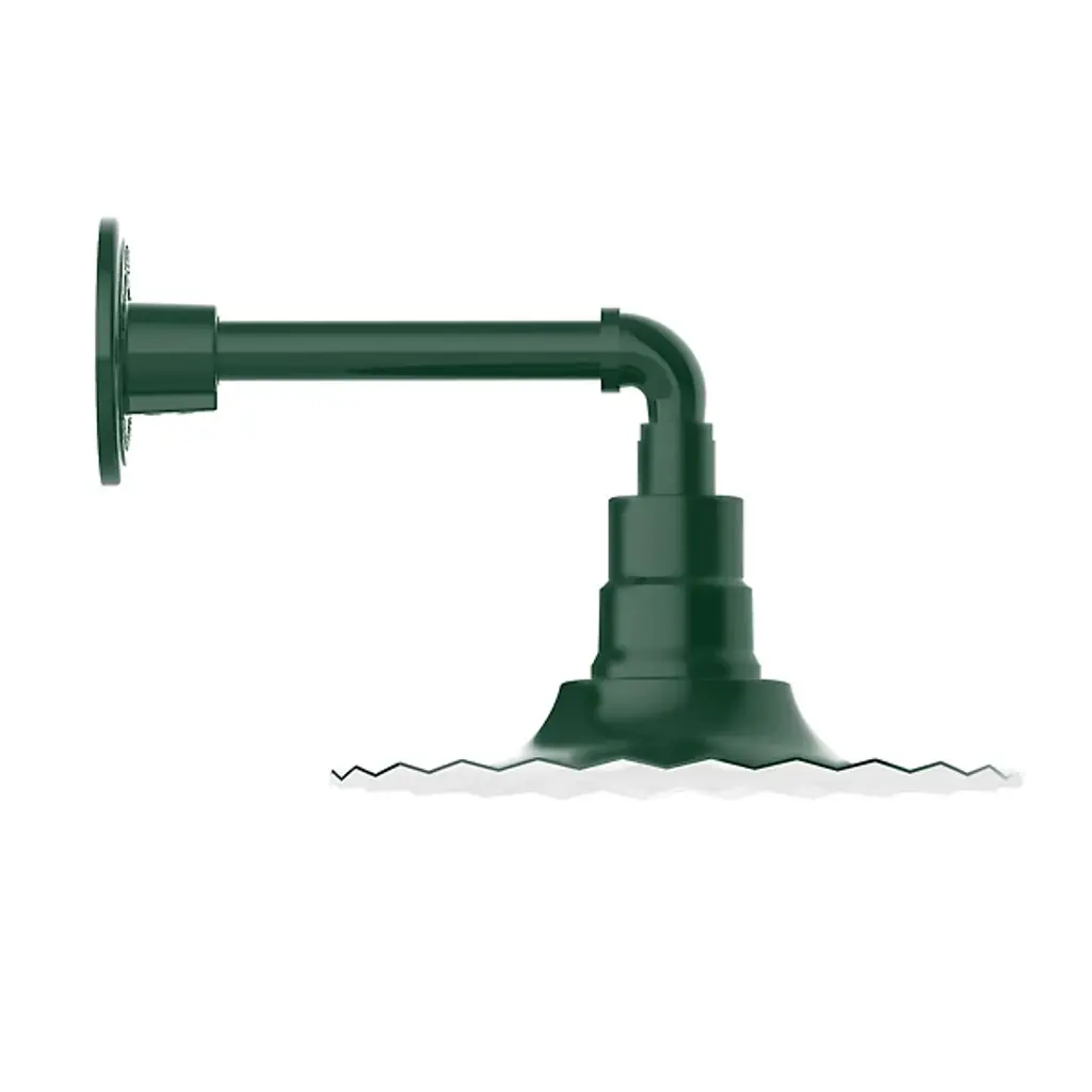 The Tucker Outdoor Gooseneck Wall Sconce from Alder & Ore pushes away water while pushing out a clean, lively light. This industrial-inspired piece strikes the right balance between form and function. The backplate says practicality as it secures to the wall without much space needed. To give the accompanying wall an enhancing glow, the piece sends out a long arm highlighted by its beautiful gooseneck silhouette. Capping of the gooseneck arm, a stepped lamp holder gives the lone bulb a focused look. The shade produces angular, radial details so that water slides down its crevices. The shade also enhances the radiant qualities of the wall-glazing down glow.