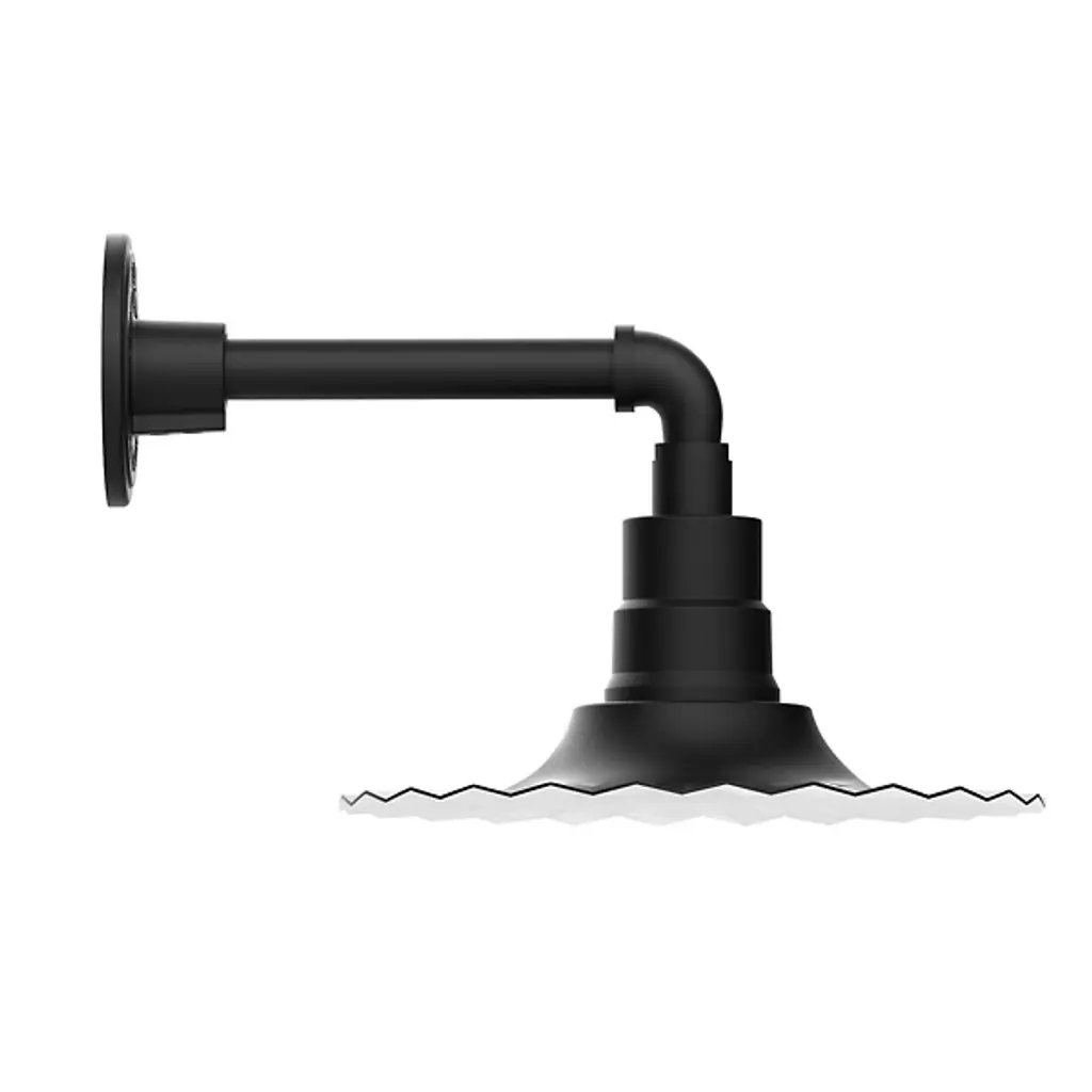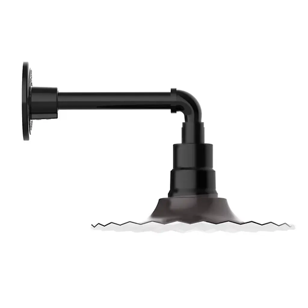 Make your exterior spaces sparkle with the simple, stylish spirit of the Tucker Outdoor Straight Arm Wall Sconce from Alder & Ore. Made with pride in the USA, this remarkable, retro-industrial offering extends a single short stem from a round, low-profile wall plate, curving down through a stylized pipe fitting to terminate in powerful, wet listed lamping placed inside a stepped cylindrical housing. A flat, slightly-flared disc shade extends down around the lamping. Its edge fluted to permit the easy passage of water across its surface. This accent offers a more intricate touch that showcases the contrast between the fixture’s matte exterior and the shade’s reflective, galvanized interior surface that so ably distributes a strong glow below.