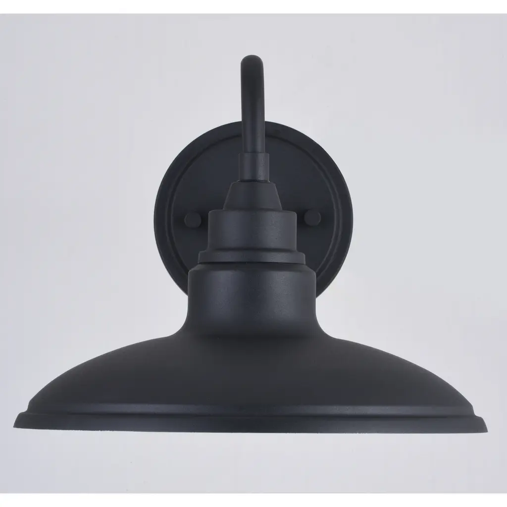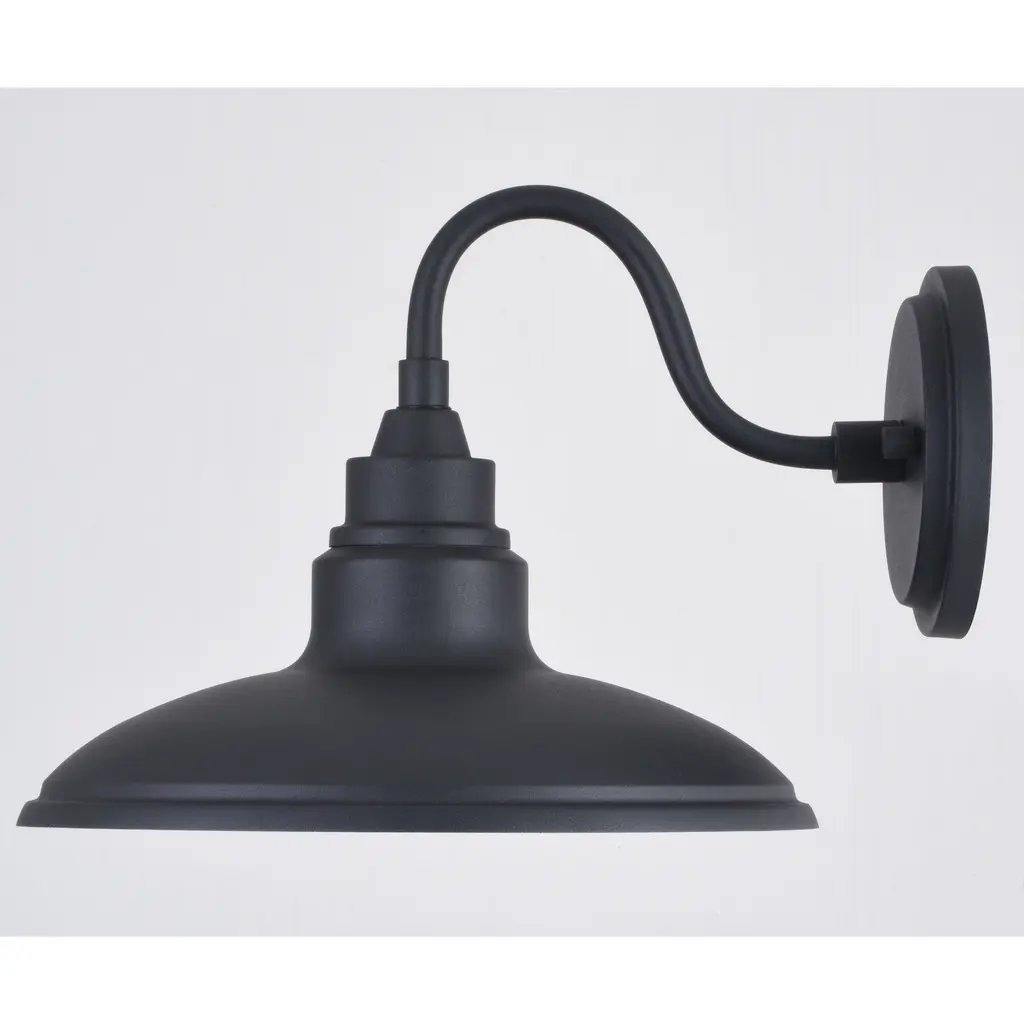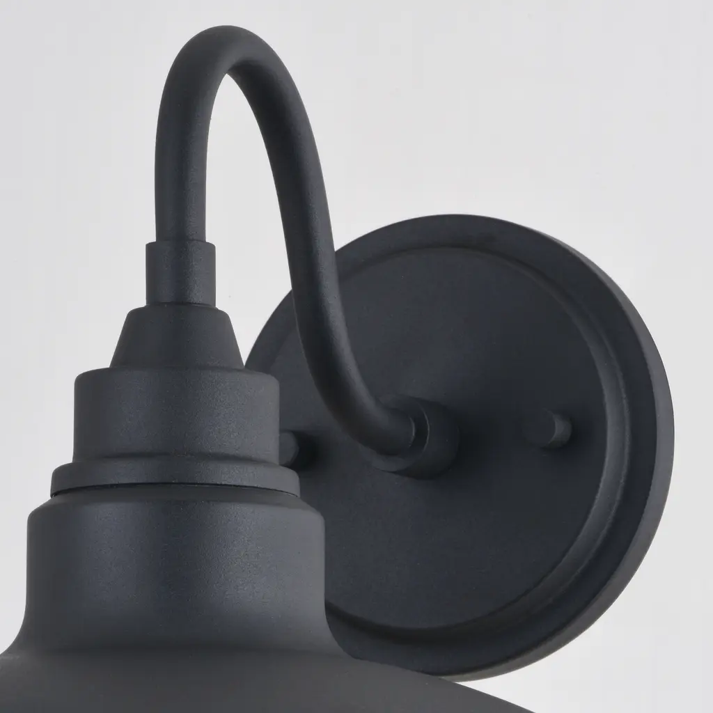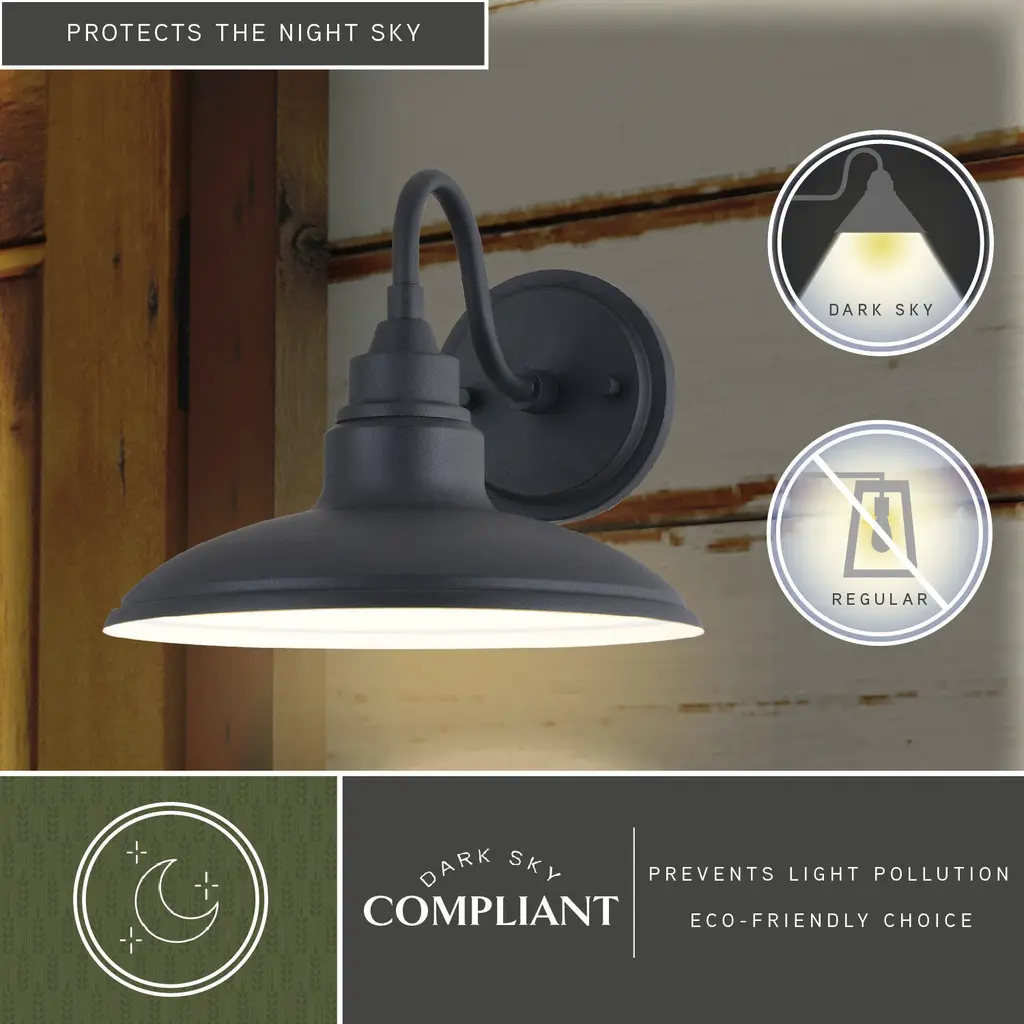 The modern farmhouse Tucson collection features a sleek low-profile design. Finished in textured black with a glossy white interior specifically designed to enhance light output. A gooseneck shaped arm suspends the metal barn shade, and an integrated LED light source provides energy savings, minimal maintenance, and long-lasting performance. This outdoor wall light is ideal for your porch, entryway, garage, or any other outdoor area of your home. Equally suited for indoor use such as the bath, hallway, or kitchen spaces.