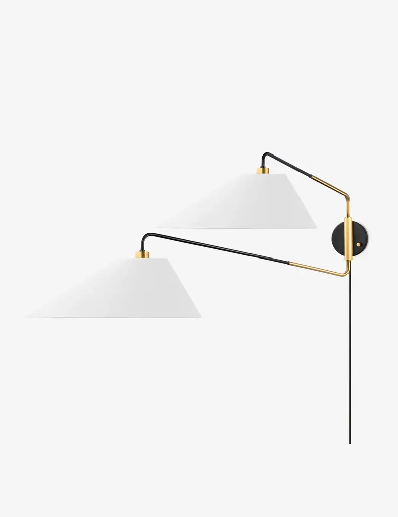 It's all about the angles with this sleek plug-in sconce light. This black-and-brass finished wall sconce is an exciting addition to any space and features a two-light design with linen shades that point and play with light. Style it behind your sectional or your favorite reading chair.