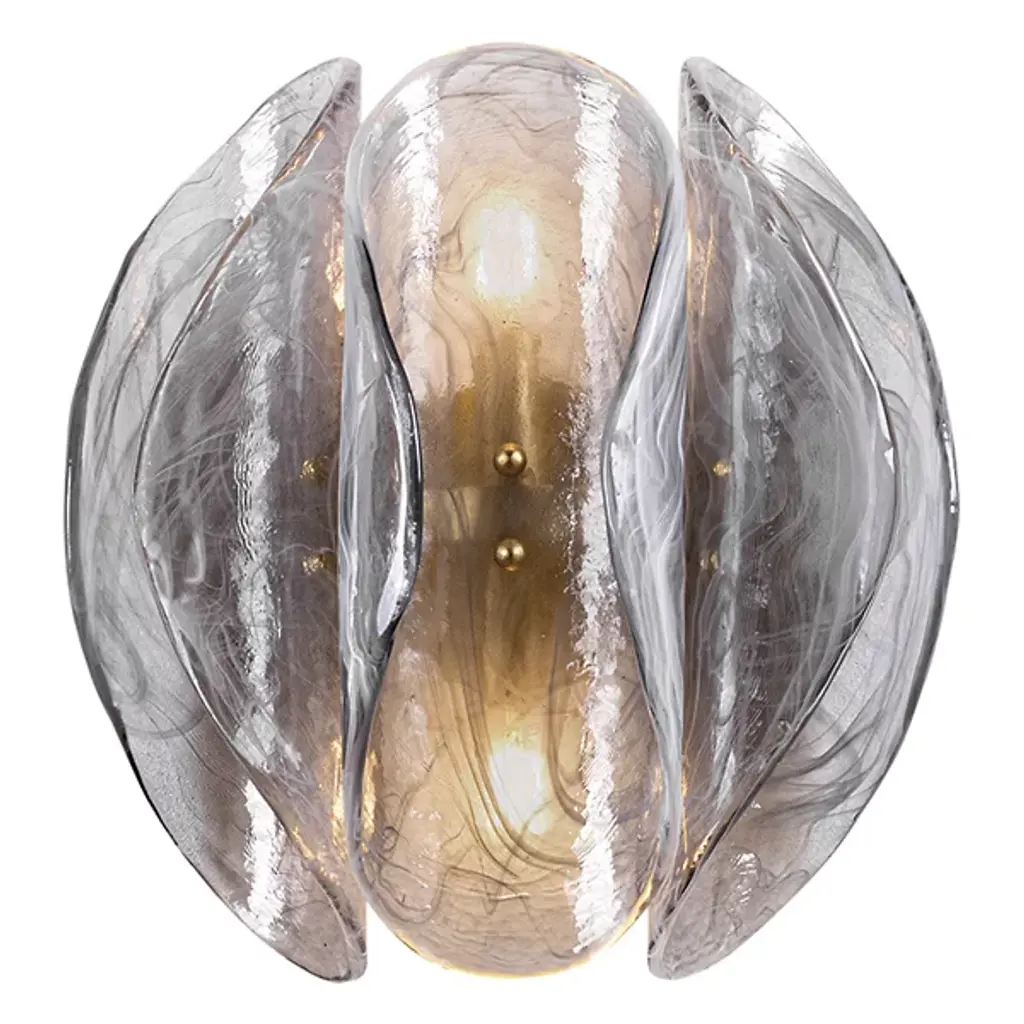 Painstakingly handcrafted by master glassblower Nicchetto, this set of two sconces enchants with its romantic tulip-like Murano glass silhouettes. A channeled design and shimmering particles of 24K gold enliven the glass to enhance its ornamental charm. These sconces' vintage value and impeccable, handmade aesthetic make them true objects d'art fitting E27 sockets.