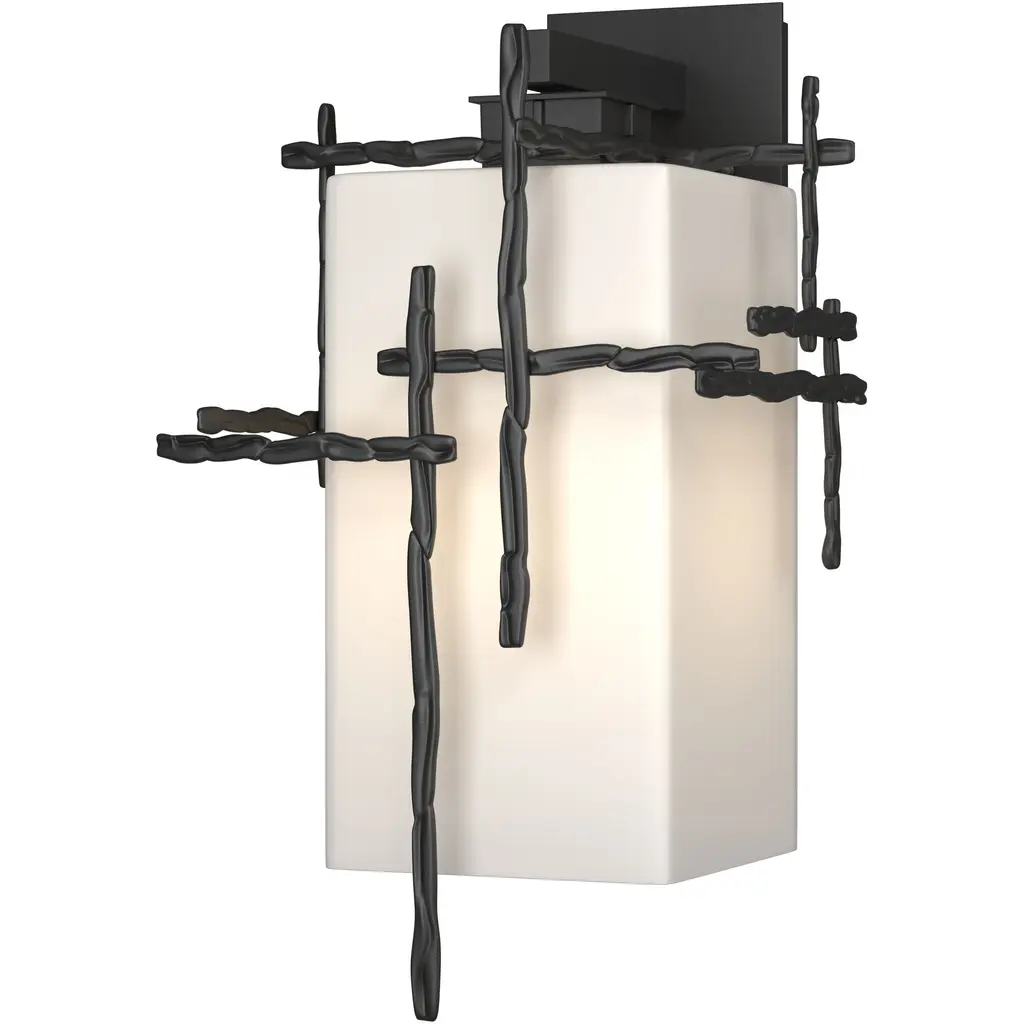 Individually hammered aluminum pieces intersect at perpendicular angles in the Tura Large Outdoor Sconce. This wall-mounted fixture is available in any of our Coastal Outdoor Finishes. An opal glass shade is beautifully accented by the aluminum structure.