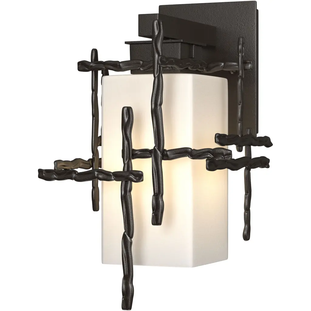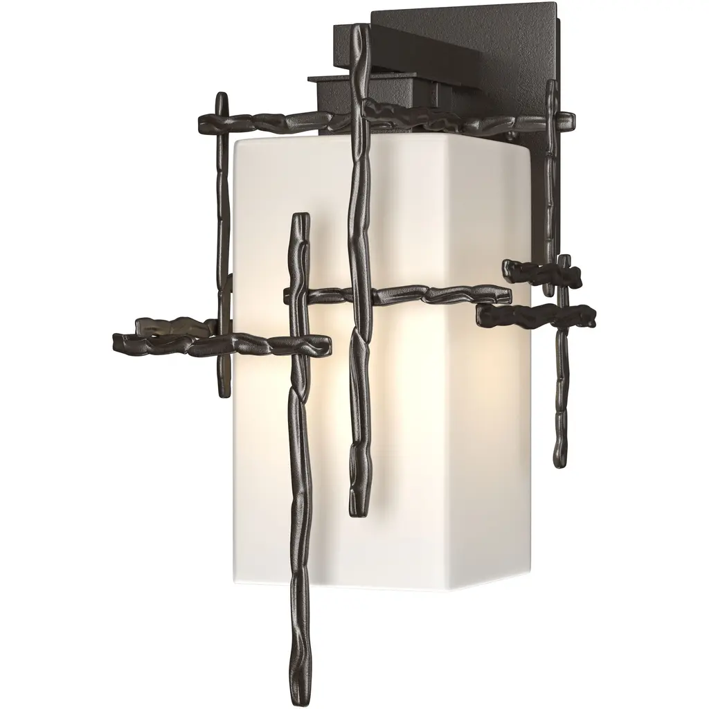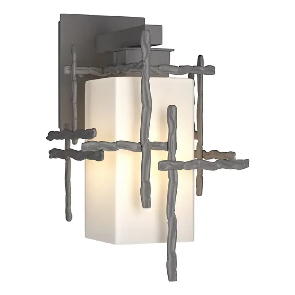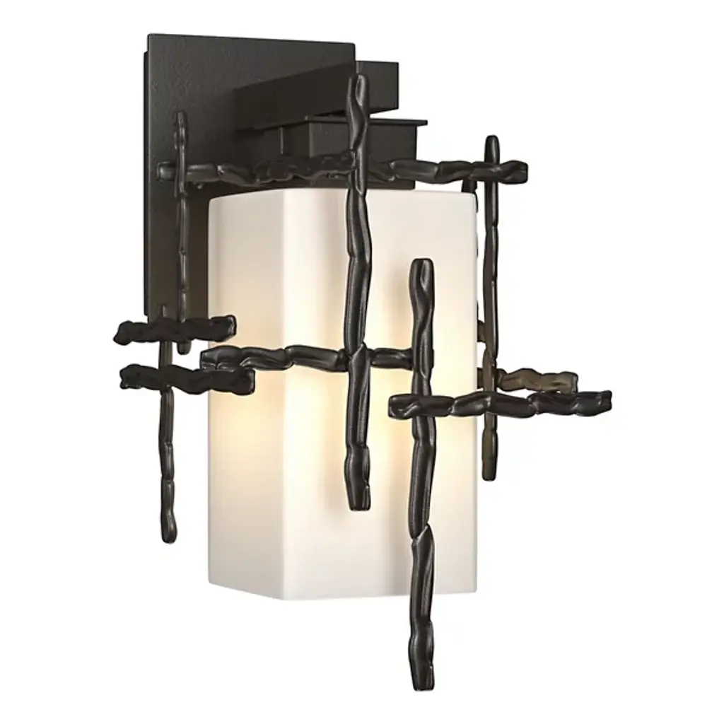A rustic modern piece designed to bring artful texture to outdoor spaces. The Tura Outdoor Wall Sconce by Hubbardton Forge was created by David Kitts with a decorative and protective twig-like cage around a rectangular glass shade. The twigs are actually annealed aluminum bars, which are hammered by hand by artisans in Vermont using custom dies and specialty trip hammers. By a front door or along a porch, this outdoor wall sconce provides welcome ambience and eye-catching craftsmanship.