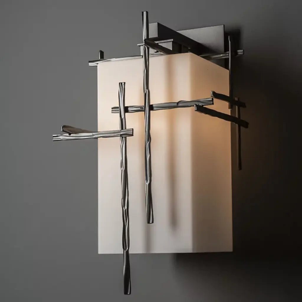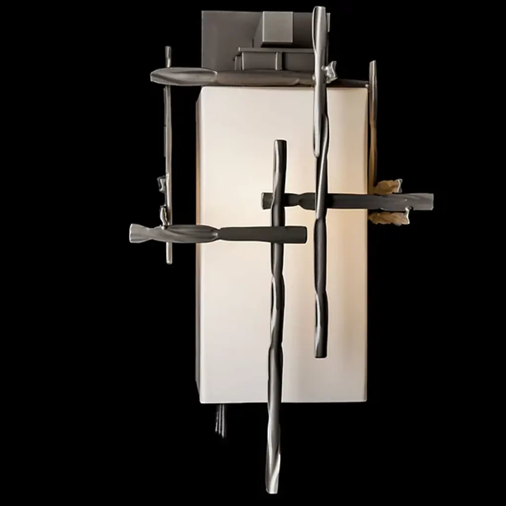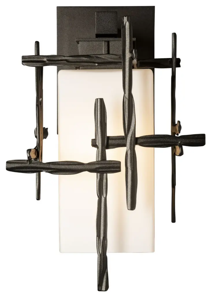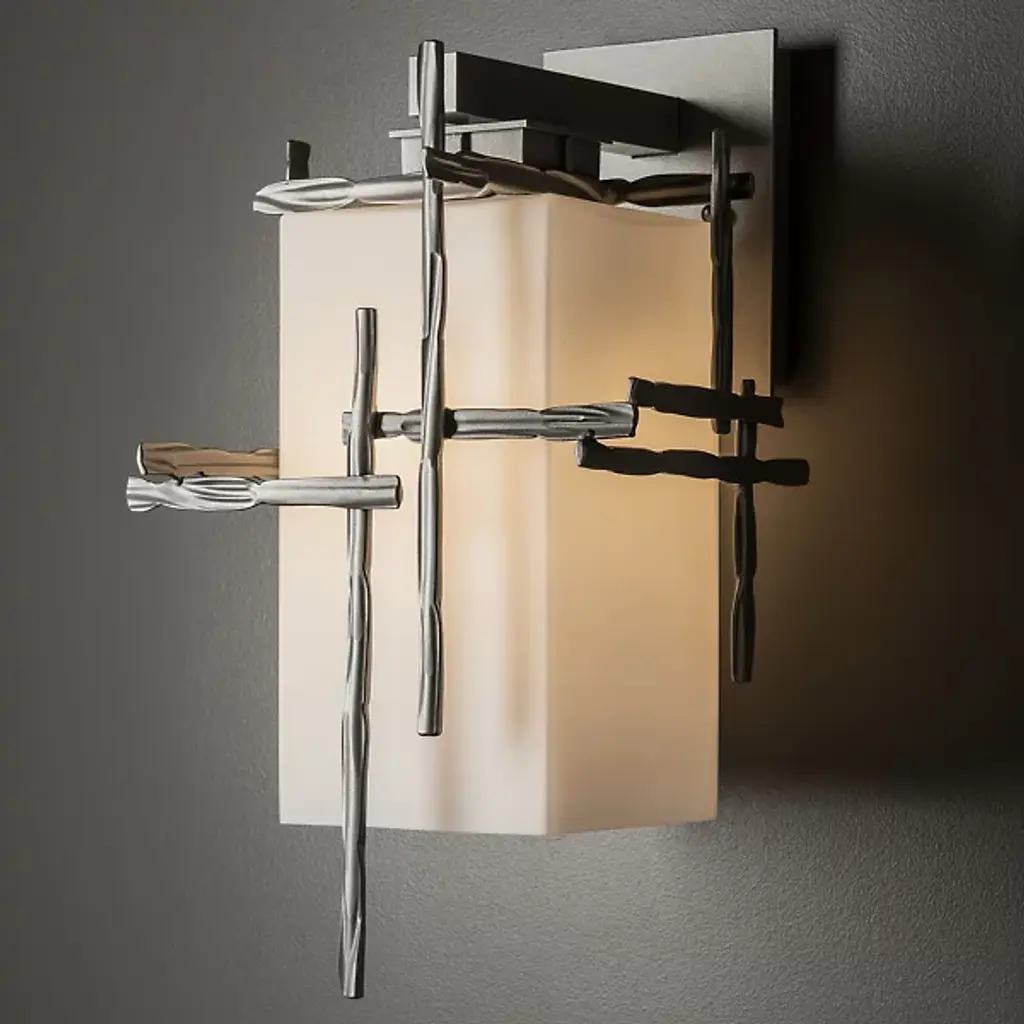 A rustic modern piece designed to bring artful texture to outdoor spaces. The Tura Outdoor Wall Sconce by Hubbardton Forge was created by David Kitts with a decorative and protective twig-like cage around a rectangular glass shade. The twigs are actually annealed aluminum bars, which are hammered by hand by artisans in Vermont using custom dies and specialty trip hammers. By a front door or along a porch, this outdoor wall sconce provides welcome ambience and eye-catching craftsmanship.
