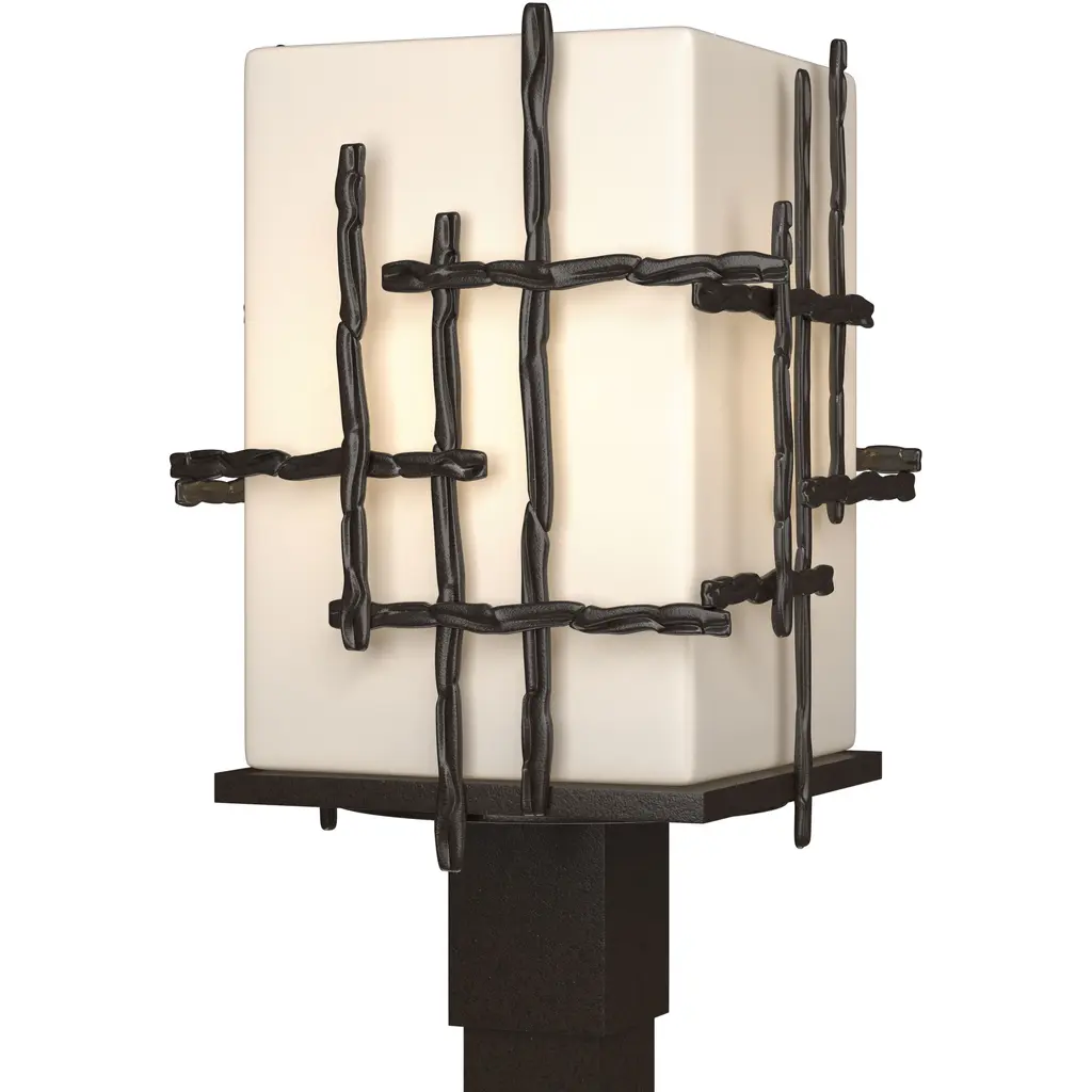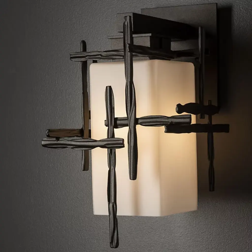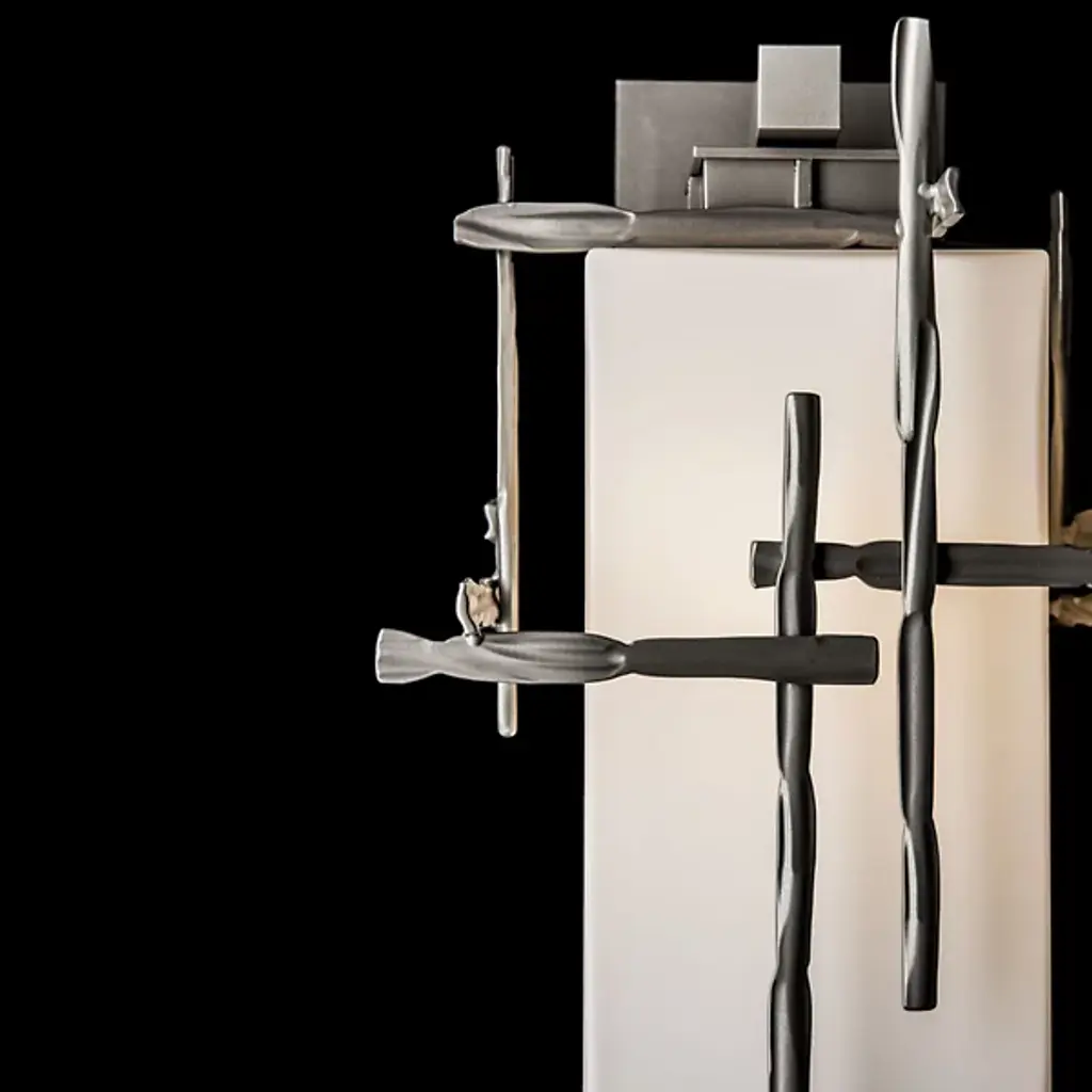 A rustic modern piece designed to bring artful texture to outdoor spaces. The Tura Outdoor Wall Sconce by Hubbardton Forge was created by David Kitts with a decorative and protective twig-like cage around a rectangular glass shade. The twigs are actually annealed aluminum bars, which are hammered by hand by artisans in Vermont using custom dies and specialty trip hammers. By a front door or along a porch, this outdoor wall sconce provides welcome ambience and eye-catching craftsmanship.