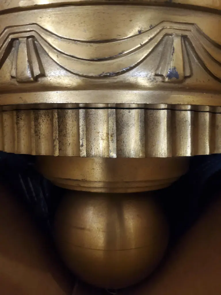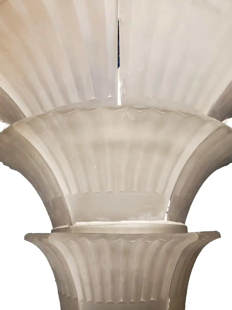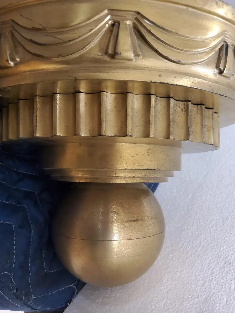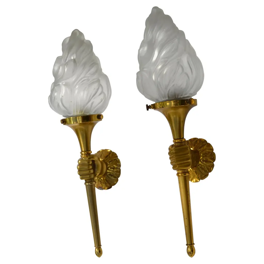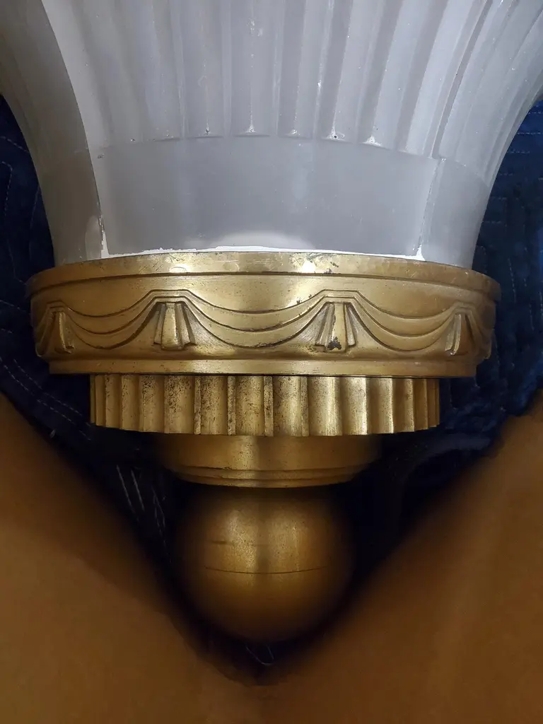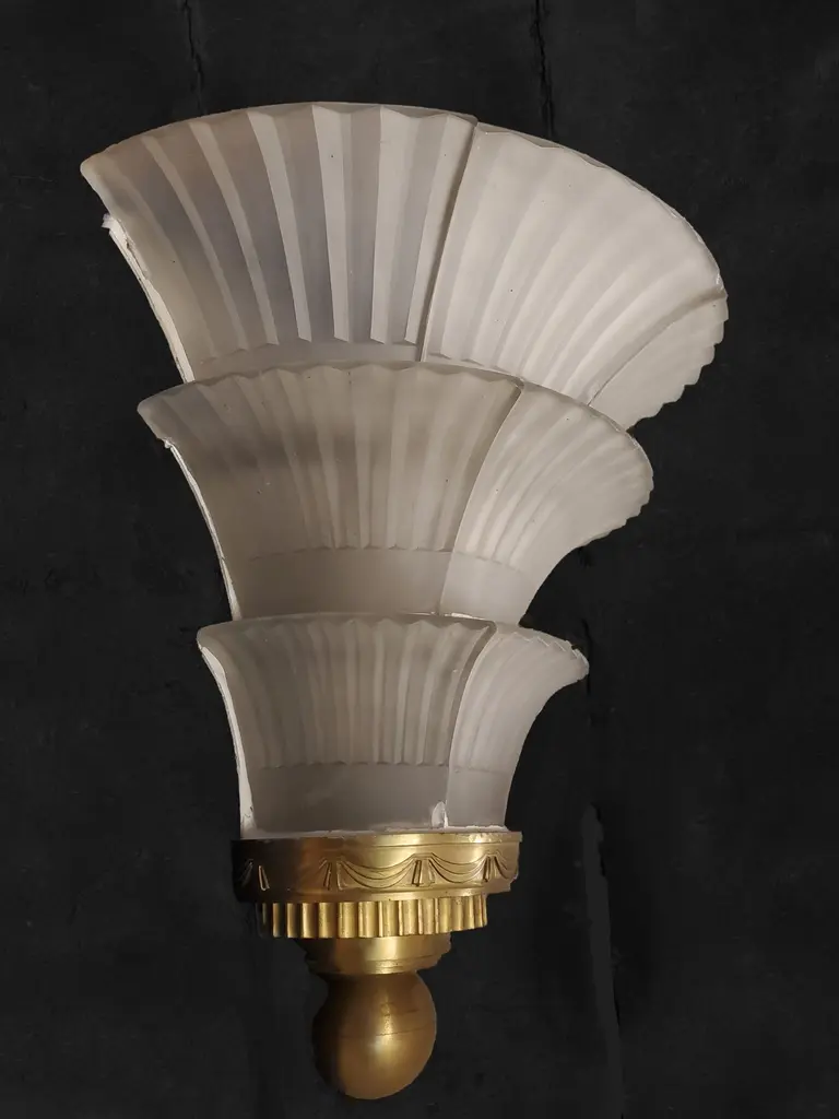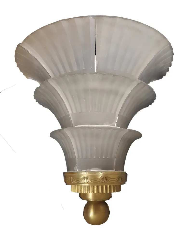 These palatial and magnificent original French Art Deco sconces are truly a work of art. The elegant fluted design of the ten frosted art glass panels cascade down in three tiers, creating a stunning visual reminiscent of a waterfall. The intricate attention to detail is evident in every aspect of these sconces, from the sweeping curves of the flutes to the sleek lines of the overall shape they form.The entity is capped at the base by a heavy gilt bronze finial with fluting and a stylized swag-like drapery pattern. This exquisite design detail adds to the overall elegance and sophistication of the sconces. The gilt bronze original finish is rich and luxurious, catching the light and creating a warm, inviting glow. The heavy weight of the finial and the overall quality speak to the high level of craftsmanship that went into the creation of these sconces.These sconces would be a perfect addition to any room that needs a touch of elegance and sophistication. Whether they are used as accent lighting in a formal dining room or as a dramatic focal point in a grand entrance hall, lobby theater, hotel, casino, lodge, palace. these sconces are sure to impress and delight. With their timeless style and remarkable craftsmanship, these sconces are a true testament to the beauty and power of French Art Deco design. chips on some of the glass panels Can be restored for an additional fee, to be discussed.Please note these sconces are very heavy.Possible additional 9th sconce available with nickel finial.