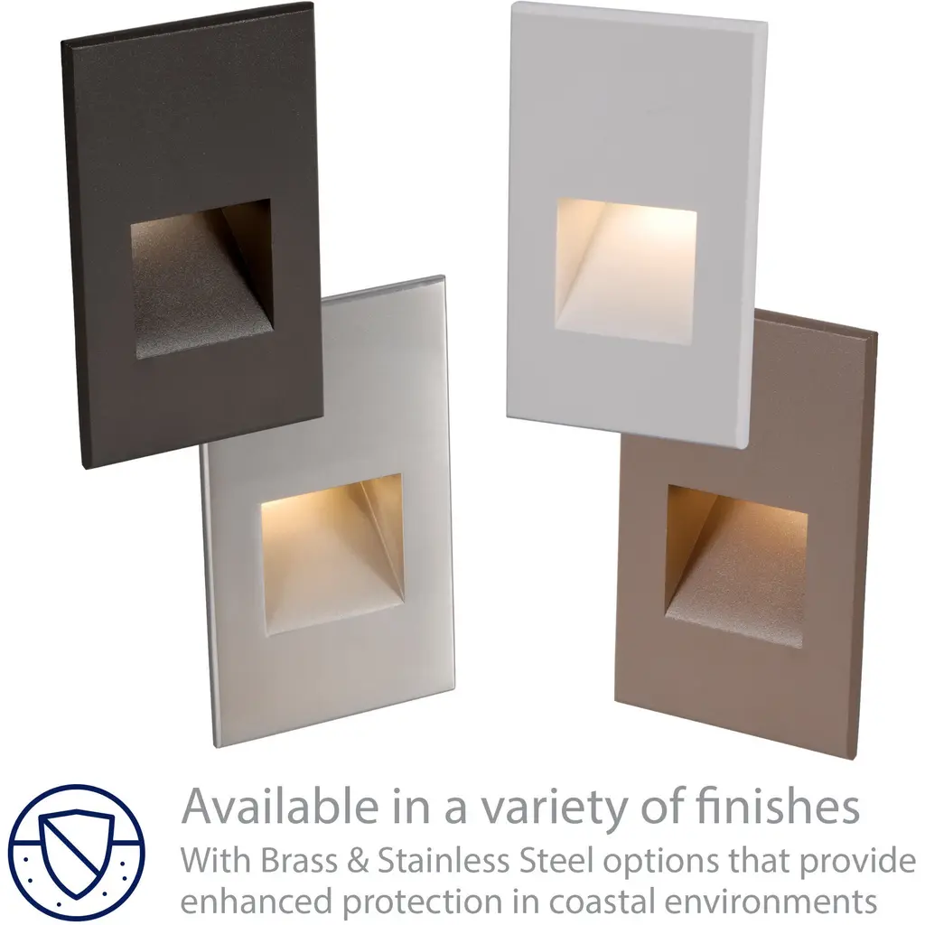 120V step and wall lights by WAC Lighting are offered in a variety of styles and can be installed onto a standard 2in x 4in electrical junction box. These luminaires offer enhanced energy efficient functionality and optimized light output to adequately illuminate stairs, walls and walkways with little or no glare and are perfect for indoor or outdoor applications. Available in 3000K warm white, 2700K warm, amber warm, blue, and red LED color temperatures - order accordingly. Factory sealed and water tight with an IP66 rating for protection against high-pressure water jets and outdoor elements. Casted using a special k-alloy aluminum that is engineered to withstand the most challenging environments over time. Stainless steel (-SS) or solid brass coated in bronze (-BBR) finishes are available for enhanced protection against corrosive elements and is recommended for use in coastal or marine environments.