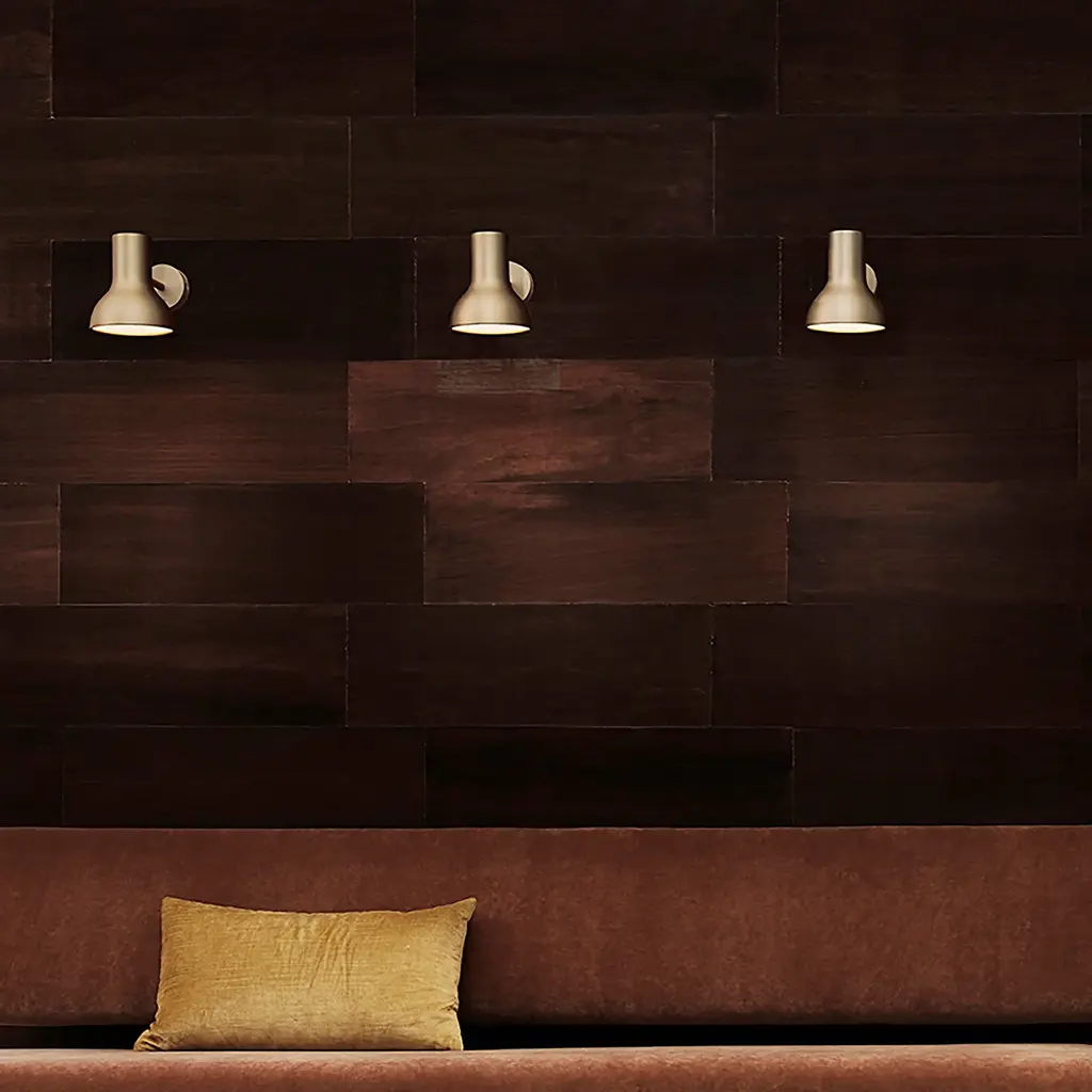 Shimmering metallic adds a rich fillip to this scaled-down version of Anglepoise's classic Type 75, designed for mounting on a wall or ceiling. Fitted with the signature metal shade that can be adjusted to cast either focused or reflected ambient light exactly where it is needed. In a trio of anodized brushed aluminium finishes—gold, silver or copper luster.