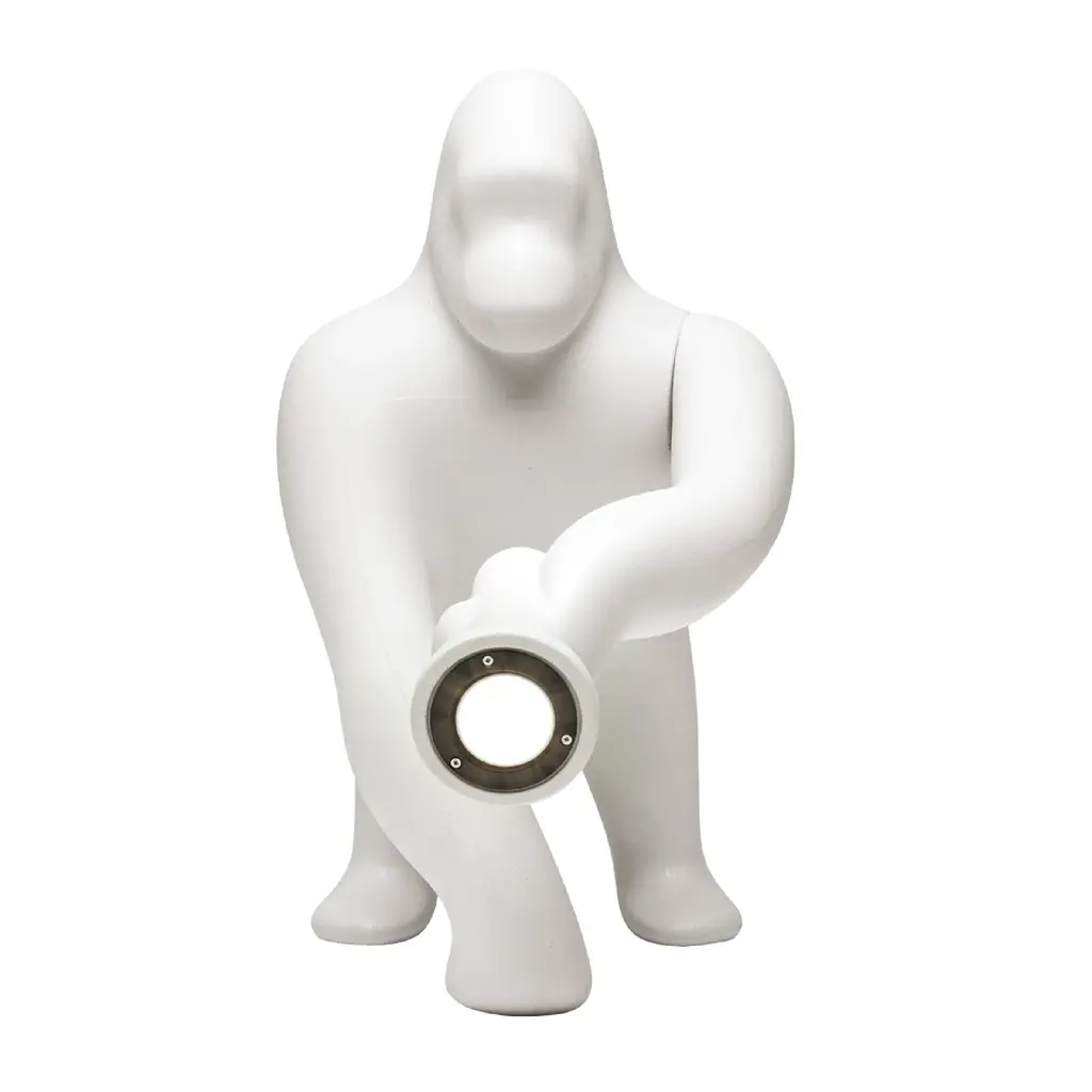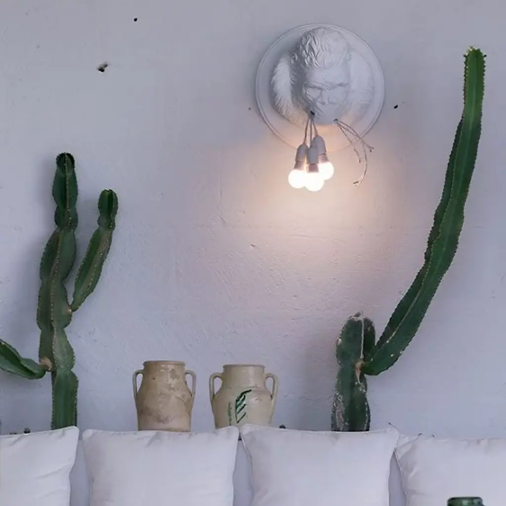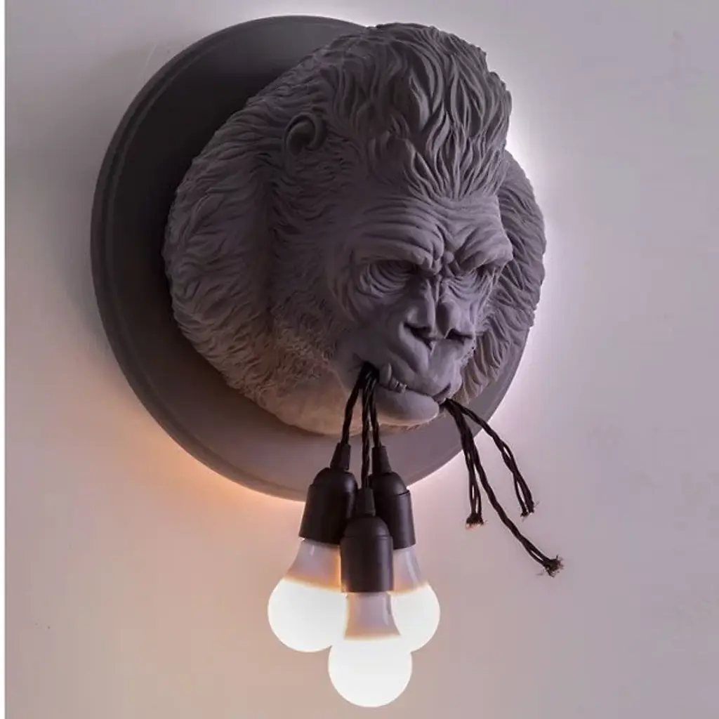 Make a bold statement by adding the Ugo Rilla Wall Sconce by Karman to interior décor. Designed by Matteo Ugolini, this composition is meant to examine the relationship between man and nature. Made of ceramic with a smooth matte finish, a gorilla’s head extends from the wall via a circular base. In his mouth is a bundle of light bulbs with seemingly torn cables, as if just ripped from another fixture. The bulbs act as the fixture’s light source, creating a warm and fiery glow.