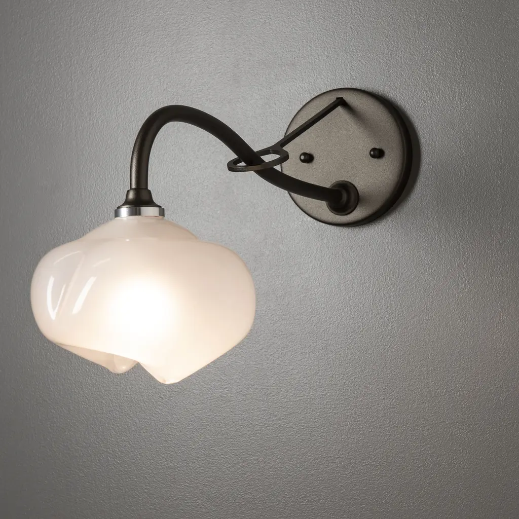 There are designs that call for greater projection for a wall mounted light. The Ume 1-Light Long-Arm Sconce is perfect for those situations. With a gently curved longer metal arm, this Ume wall sconce features the Ume frosted shade, shaped like its namesake Japanese plum blossom and made of a unique frosted inside/glossy outside. Available in Black, Oil Rubbed Bronze, Vintage Platinum, Soft Gold, Sterling and Modern Brass.