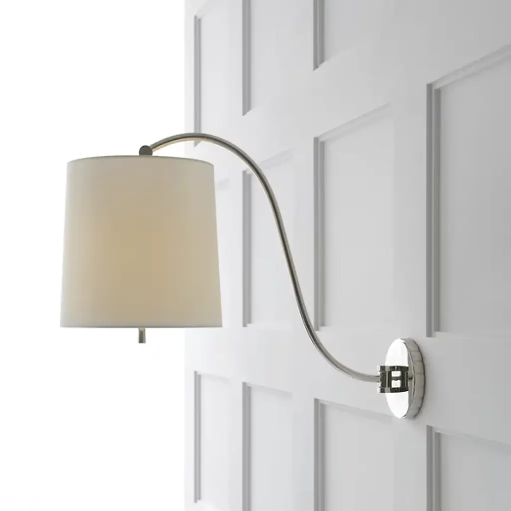 Seamless in lighting, flawless in form, the Understudy Wall Sconce by Visual Comfort Signature, formerly known as Visual Comfort, brings a decorative flourish to your living space. Its design features a round Silk shade which suspends from a dramatically curved arm and ribbed wallplate and can be rotated side to side to angle the light where you need it most.
