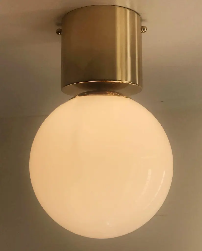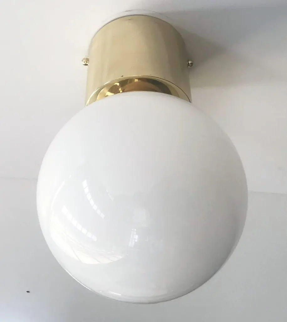 Italian flush mount with Murano glass globe and brass frame / Made in ItalyDesigned by Fabio Ltd, inspired by Angelo Lelli and Arredoluce styles1 light / E12 or E14 type / max 40WHeight: 12.5 inches / Diameter: 8 inchesOrder only / This item ships from ItalyOrder Reference #: FABIOLTD UNO GLOBEThe listed price applies to all Brass finishes : Unlacquered Natural Brass, Unlacquered Polished Brass, Lacquered Polished Brass, Lacquered Satin BrassOther finishes available with upcharge of $100 : Bronzed, Polished Chrome, Satin Chrome, Polished Nickel, Satin Nickel, Polished Black Nickel, Satin Black Nickel, Polished Copper, Satin Copper