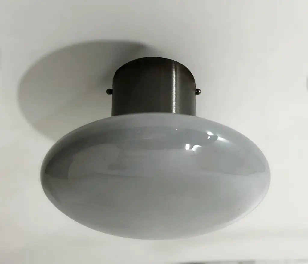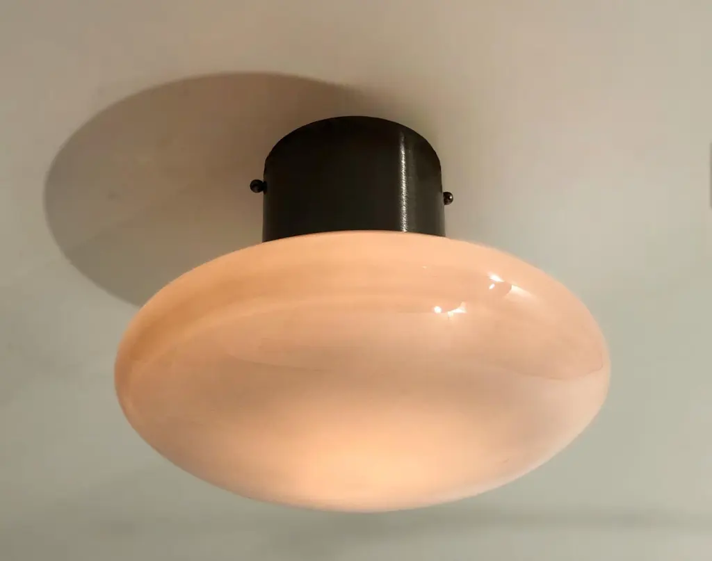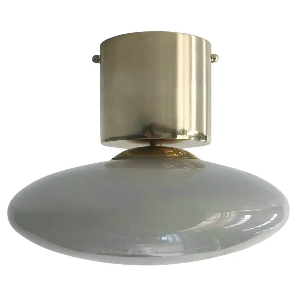 Italian flush mount with Murano glass shade and brass frame shown in satin black nickel finish / Made in ItalyDesigned by Fabio Ltd, inspired by Angelo Lelli and Arredoluce styles1 light / E12 or E14 type / max 40W eachDiameter: 12 inches / Height: 9.5 inchesOrder only / This item ships from ItalyOrder Reference: FABIOLTD UNO SHADEThe listed price applies to the following finishes : Bronzed, Polished Chrome, Satin Chrome, Polished Nickel, Satin Nickel, Polished Black Nickel, Satin Black Nickel, Polished Copper, Satin CopperOther finishes are available : Unlacquered Natural Brass, Unlacquered Polished Brass, Lacquered Polished Brass, Lacquered Satin Brass
