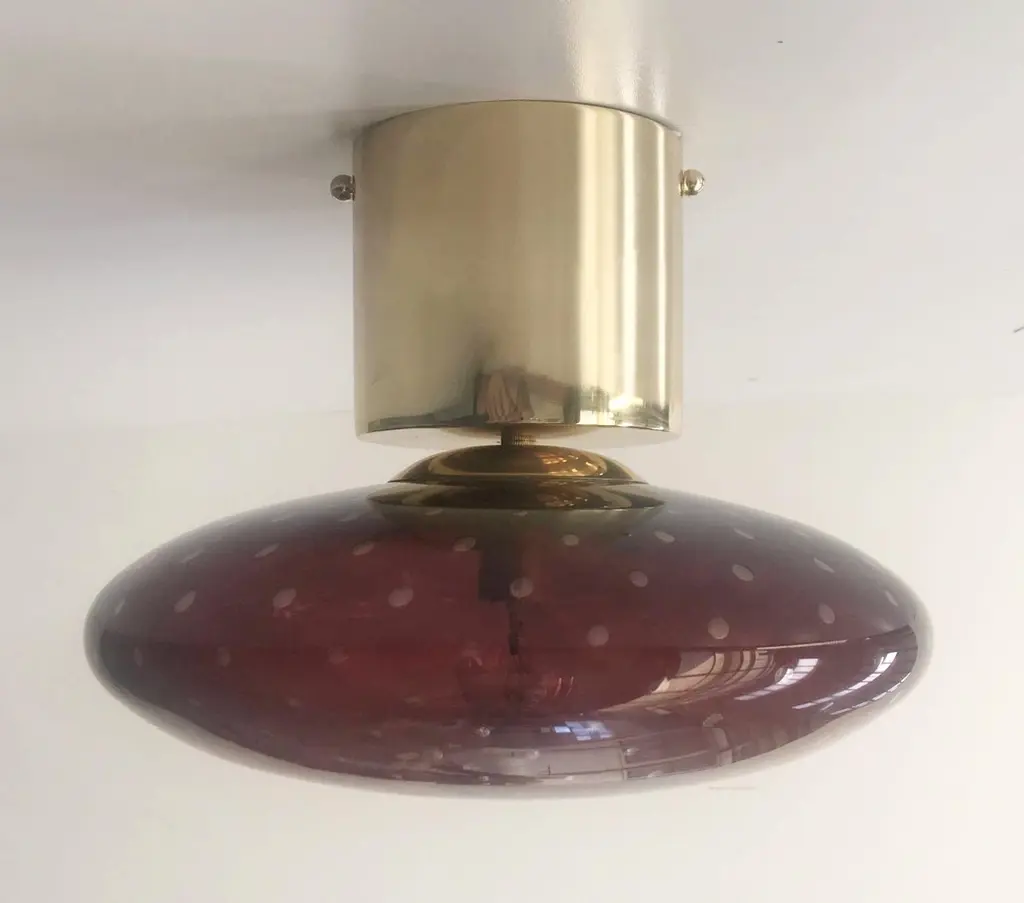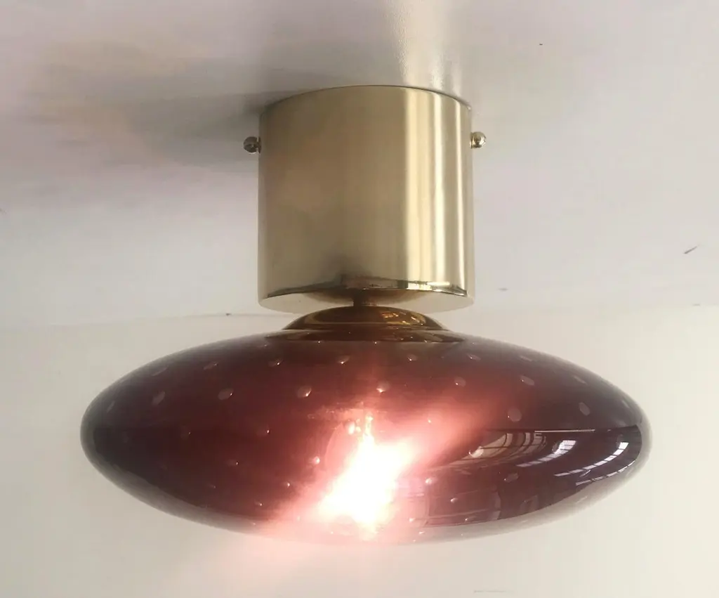 Italian flush mount with Murano glass shade and brass frame / Made in ItalyDesigned by Fabio Ltd, inspired by Angelo Lelli and Arredoluce styles1 light / E12 or E14 type / max 40W eachDiameter: 12 inches / Height: 9.5 inchesOrder only / This item ships from ItalyOrder Reference: FABIOLTD UNO SHADEThe listed price applies to all Brass finishes : Unlacquered Natural Brass, Unlacquered Polished Brass, Lacquered Polished Brass, Lacquered Satin BrassOther finishes available with upcharge of $100 : Bronzed, Polished Chrome, Satin Chrome, Polished Nickel, Satin Nickel, Polished Black Nickel, Satin Black Nickel, Polished Copper, Satin Copper