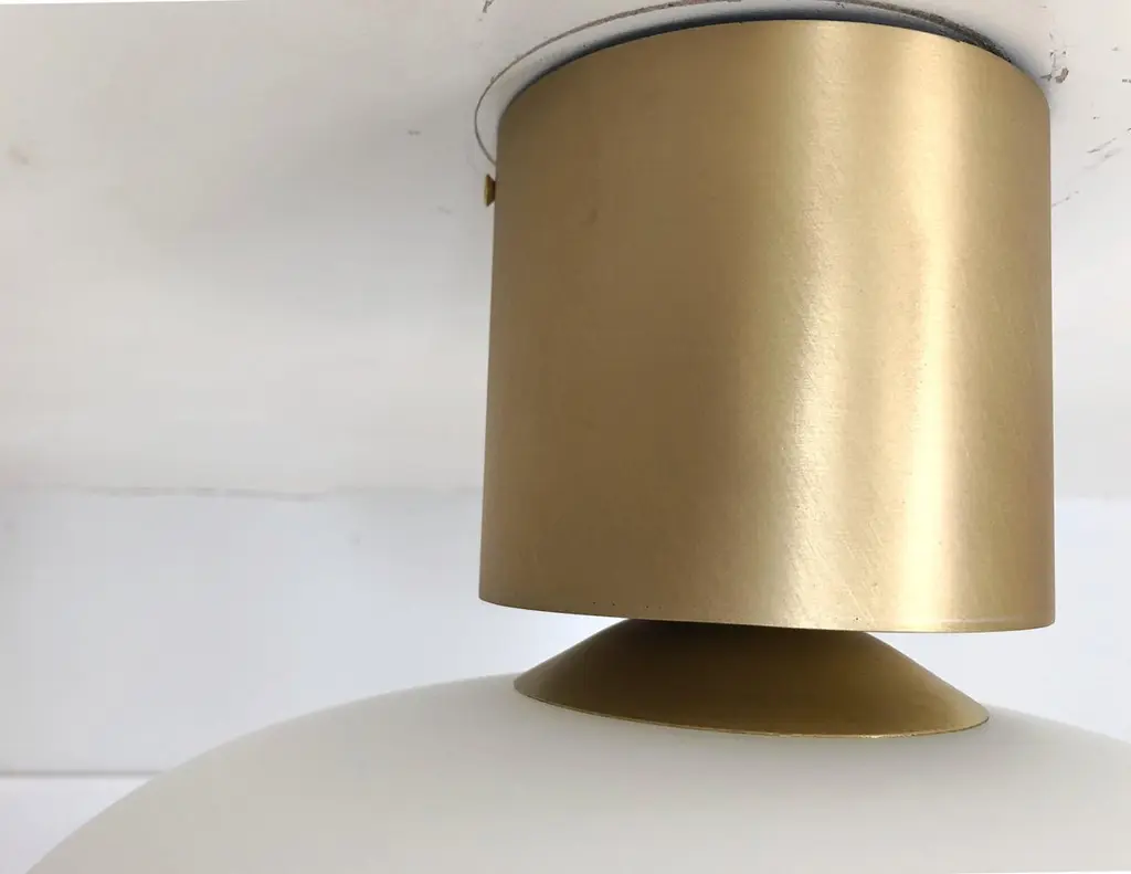 Italian flush mount with Murano glass shade and brass frame / Made in ItalyDesigned by Fabio Ltd, inspired by Angelo Lelli and Arredoluce styles1 light / E12 or E14 type / max 40W eachDiameter: 12 inches / Height: 9.5 inchesOrder only / This item ships from ItalyOrder Reference: FABIOLTD UNO SHADEThe listed price applies to all Brass finishes : Unlacquered Natural Brass, Unlacquered Polished Brass, Lacquered Polished Brass, Lacquered Satin BrassOther finishes available with upcharge of $100 : Bronzed, Polished Chrome, Satin Chrome, Polished Nickel, Satin Nickel, Polished Black Nickel, Satin Black Nickel, Polished Copper, Satin Copper