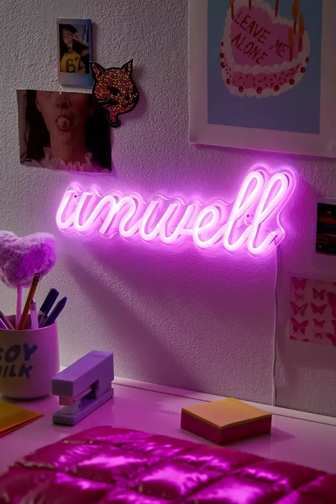 Channel your inner-most feelings when you display this neon sign featuring Unwell slogan text. Finished with vivid pink LED lights, this sign is complete with an acrylic backing for easy hanging. Plugs in to power on. Available exclusively at Urban Outfitters.